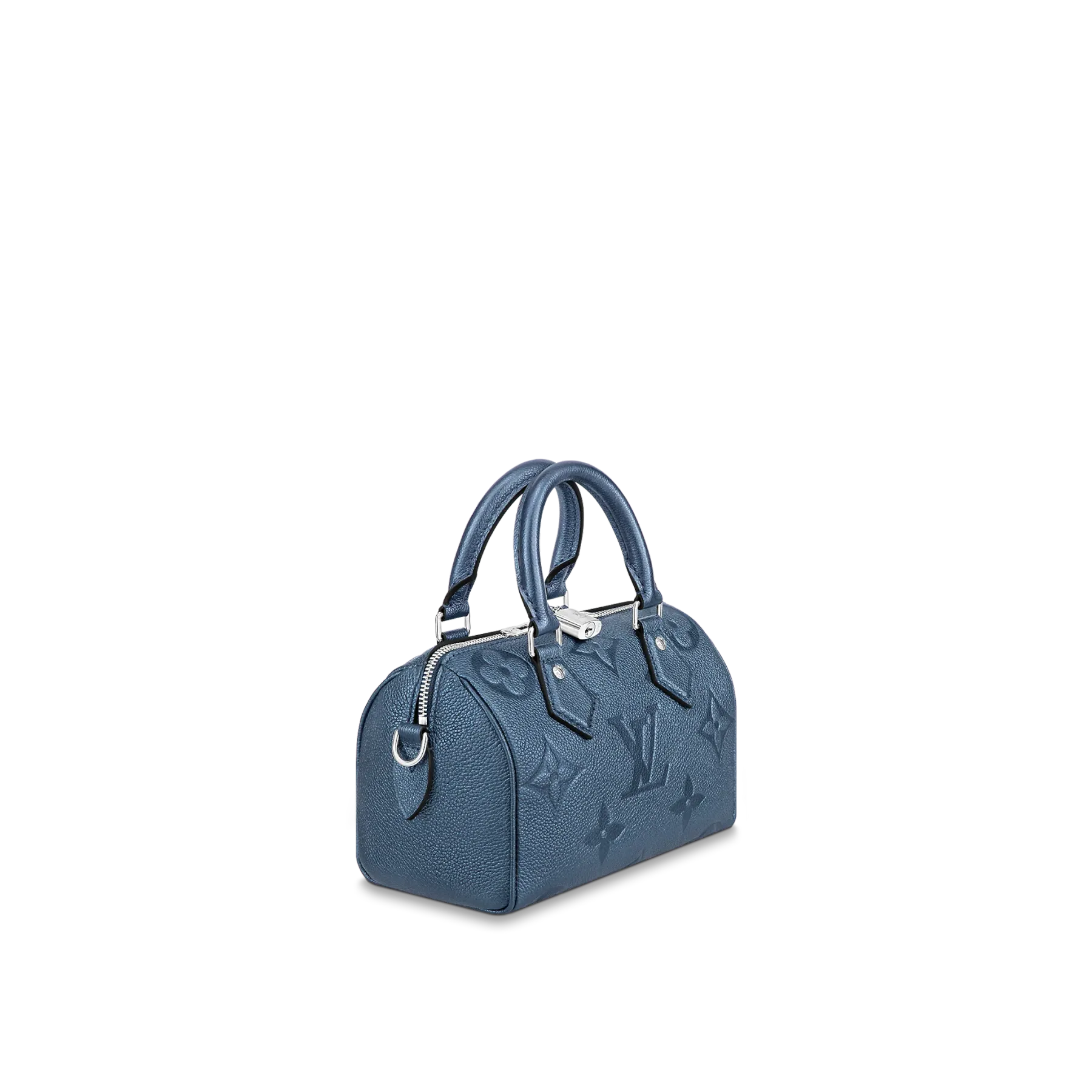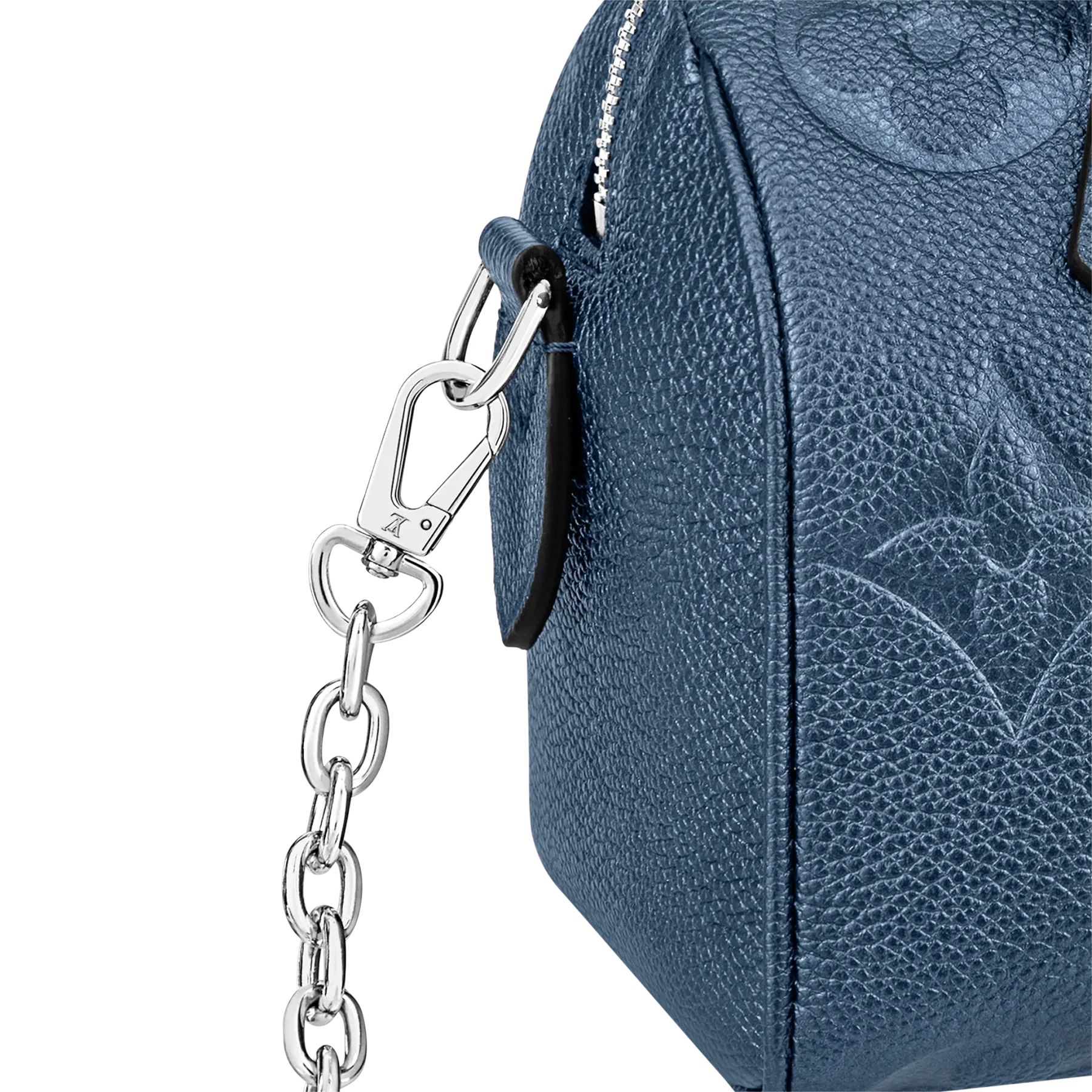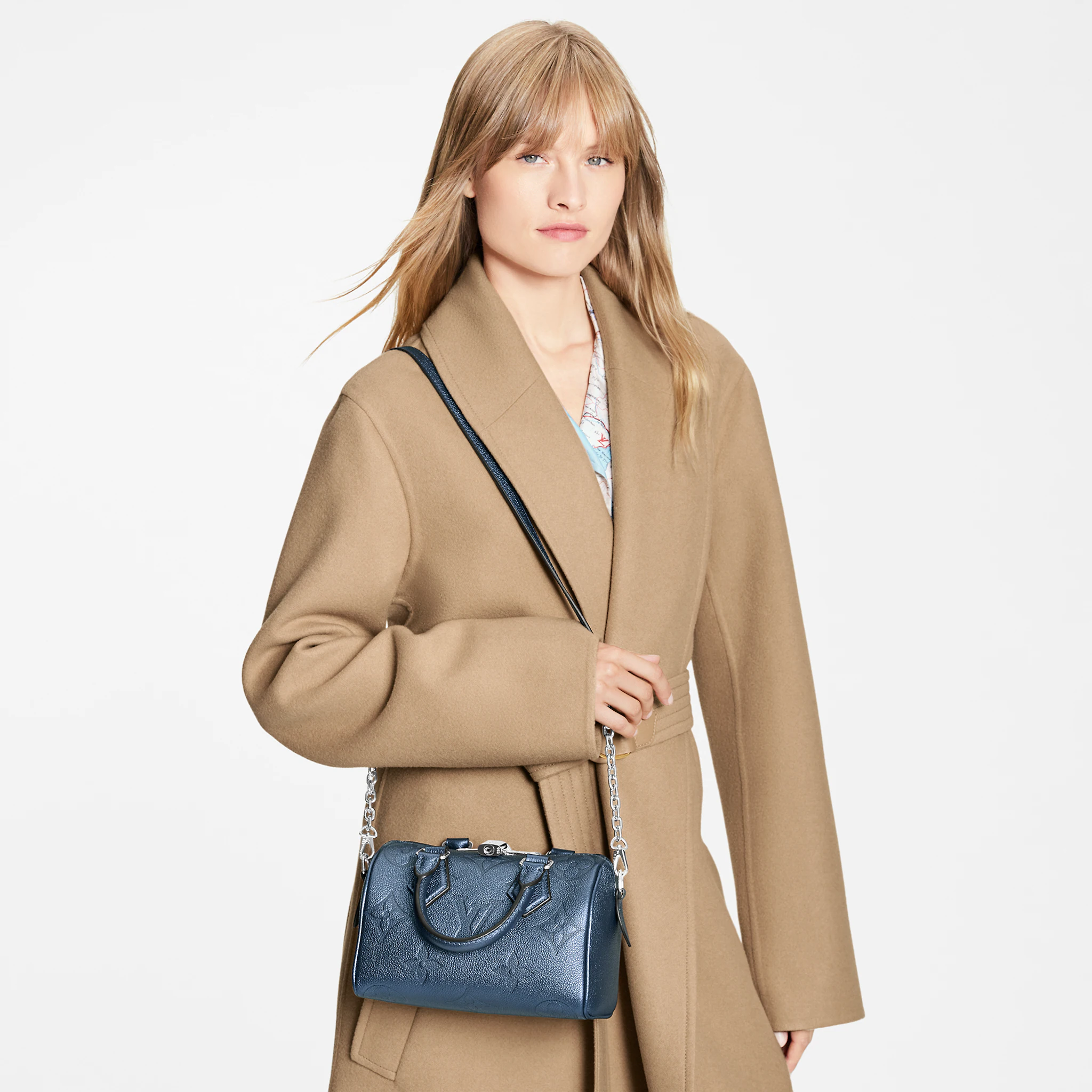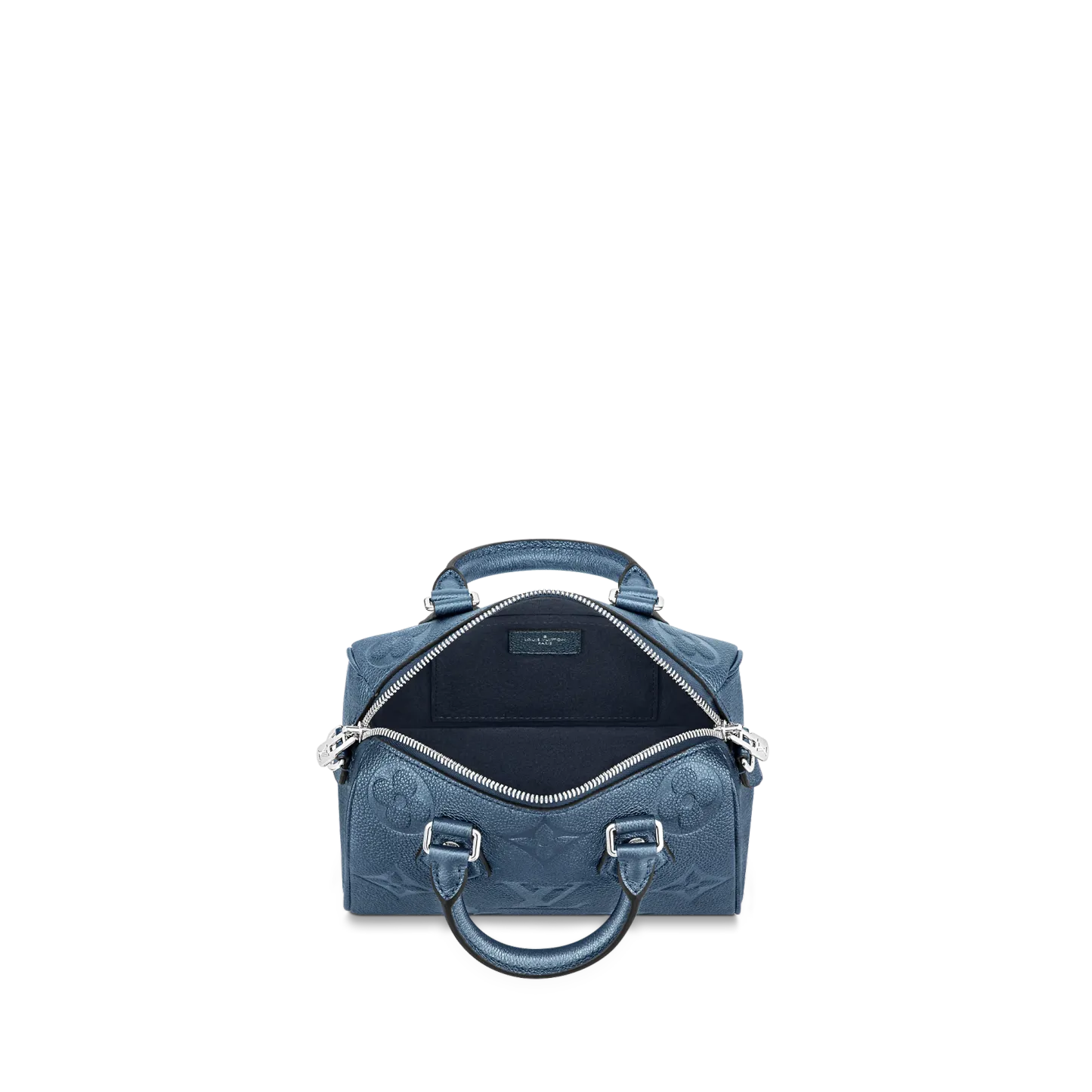 With its singular silhouette, Toron handles and engraved padlock, the adorable Speedy Bandoulière 20 handbag is emblematic of Louis Vuitton’s design traditions. In shimmering and festive navy-blue Monogram Empreinte leather with the Oversized Monogram pattern, it is the perfect contemporary companion. A removable chain-and-leather strap enable shoulder and cross-body carry.