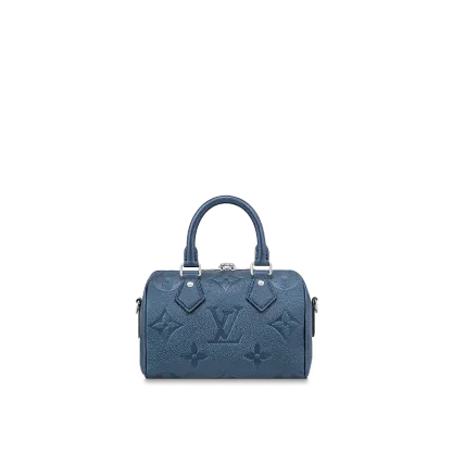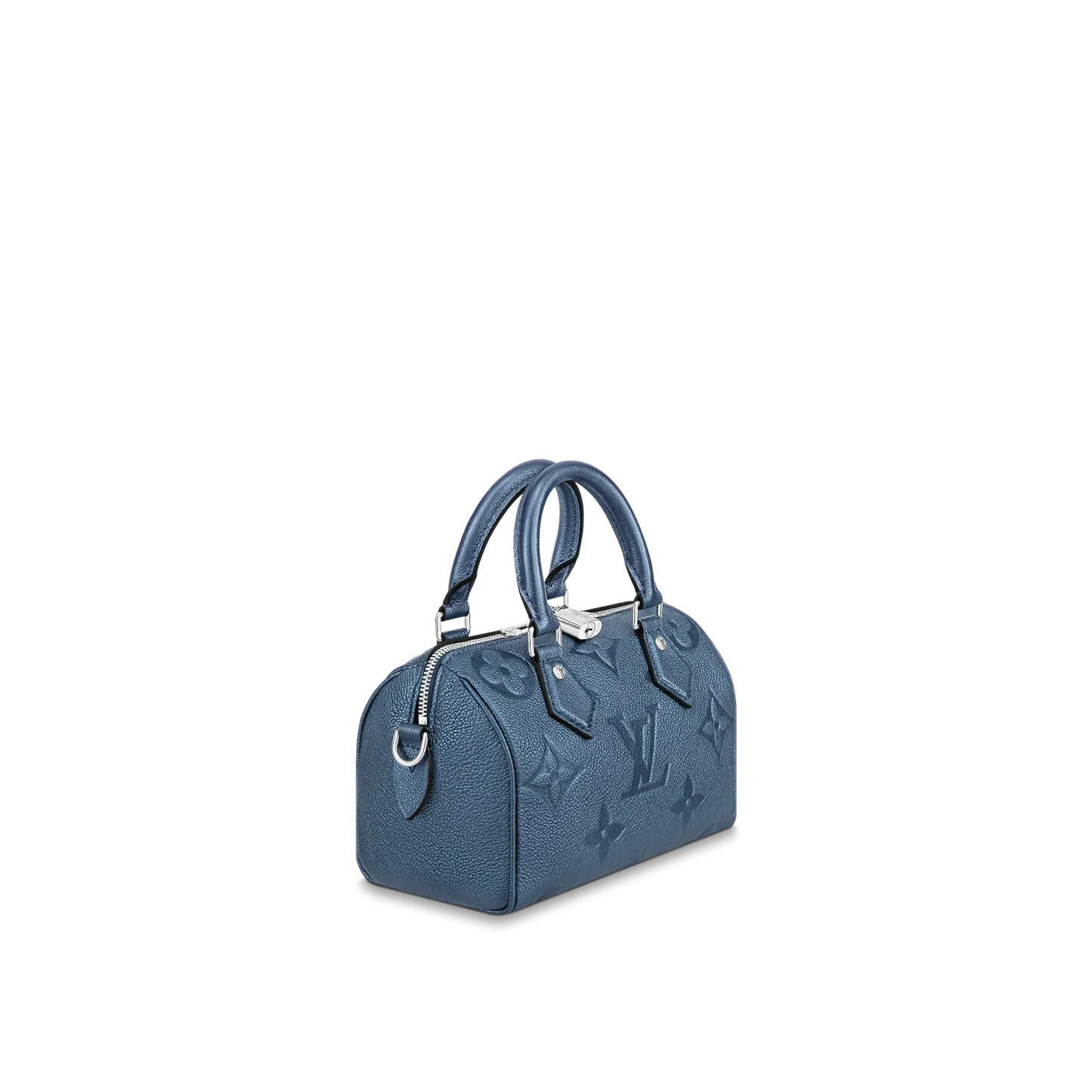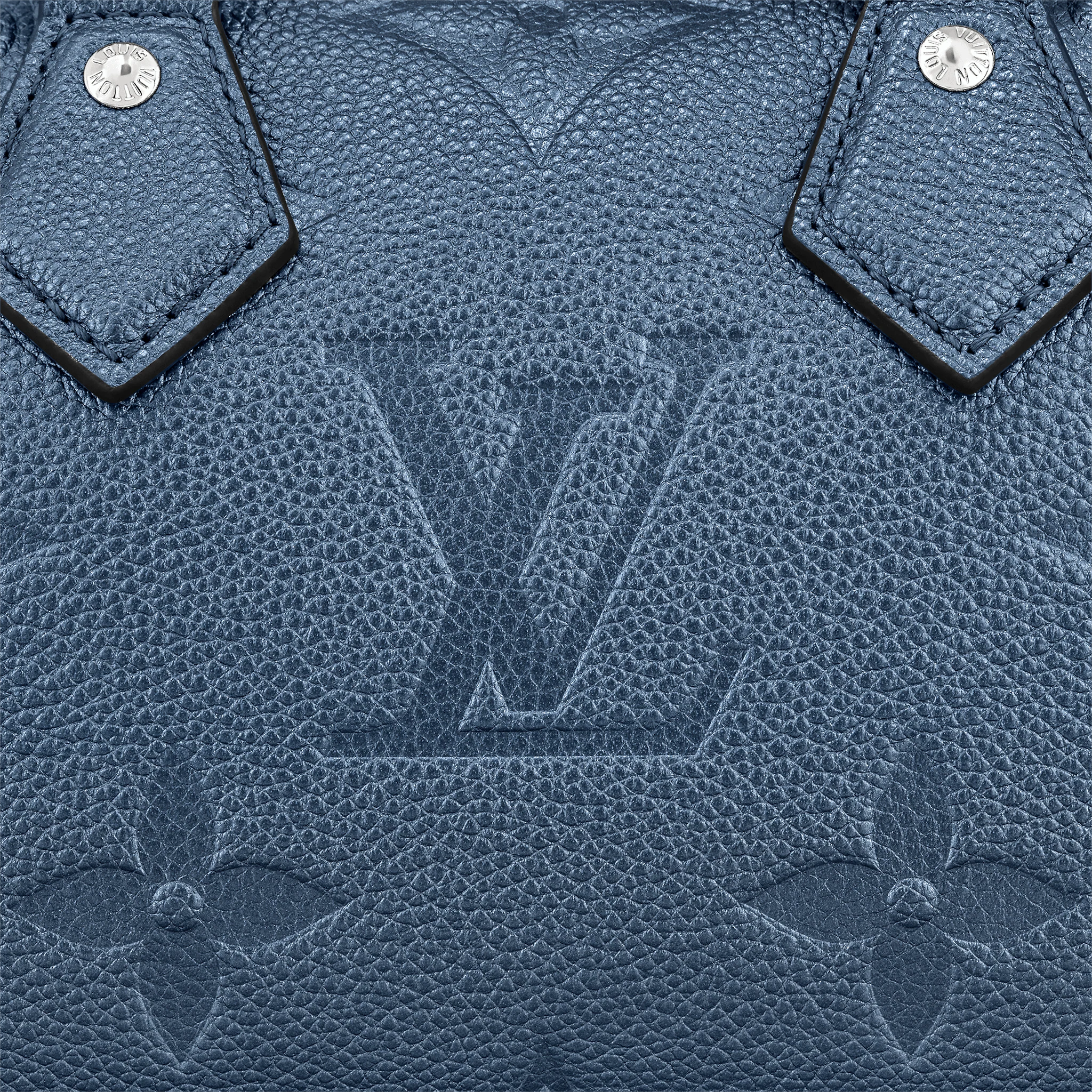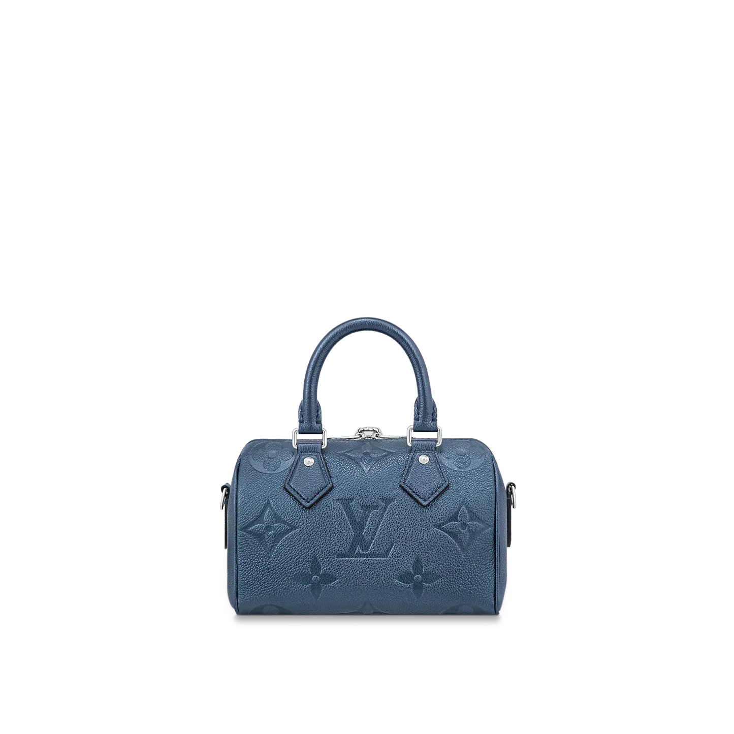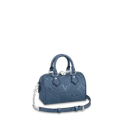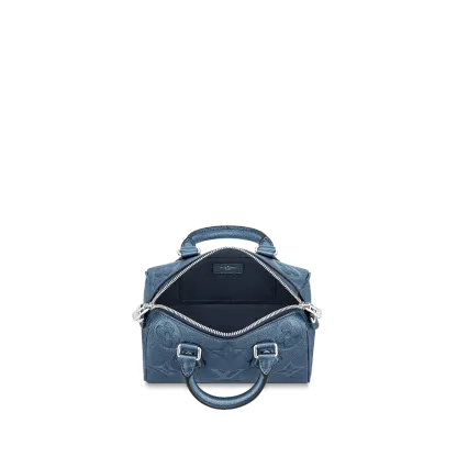 With its singular silhouette, Toron handles and engraved padlock, the adorable Speedy Bandoulière 20 handbag is emblematic of Louis Vuitton’s design traditions. In shimmering and festive navy-blue Monogram Empreinte leather with the Oversized Monogram pattern, it is the perfect contemporary companion. A removable chain-and-leather strap enable shoulder and cross-body carry.