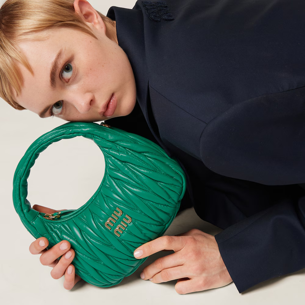 The Wander bag is reinterpreted season after season, becoming an iconic accessory of Miu Miu collections. Made of matelassé nappa leather, the bag is characterized by the sophisticated, three-dimensional effect created by the refined workmanship. The hobo shape, blending retro inspirations and contemporary elegance, becomes a new synonym of modern femininity.