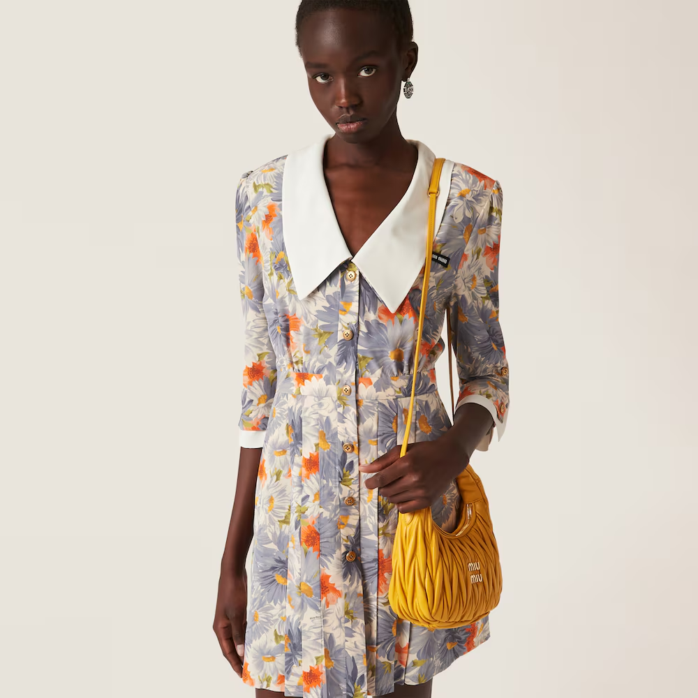 The Wander bag is reinterpreted season after season, becoming an iconic accessory of Miu Miu collections. Made of matelassé nappa leather, the bag is characterized by the sophisticated, three-dimensional effect created by the refined workmanship. The hobo shape, blending retro inspirations and contemporary elegance, becomes a new synonym of modern femininity.