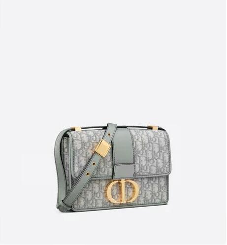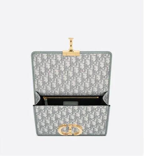 The 30 Montaigne line, inspired by the hallmark address, offers essential pieces that embody the House's iconic codes. The handbag is crafted in gray Dior Oblique jacquard for an elegant and modern design. The flap has an antique gold-finish metal 'CD' clasp, inspired by the seal of a Christian Dior perfume bottle. Other details, like the embossed '30 MONTAIGNE' signature at the back and the military-inspired buckle highlight the streamlined design. The style has an adjustable leather shoulder strap and can be carried by hand, worn over the shoulder or crossbody.