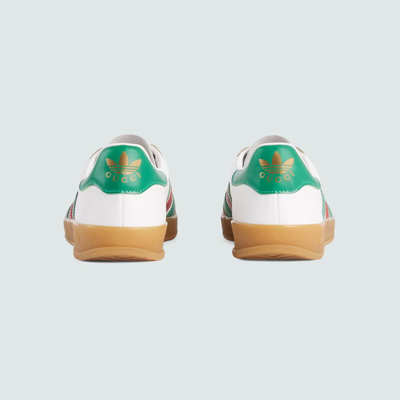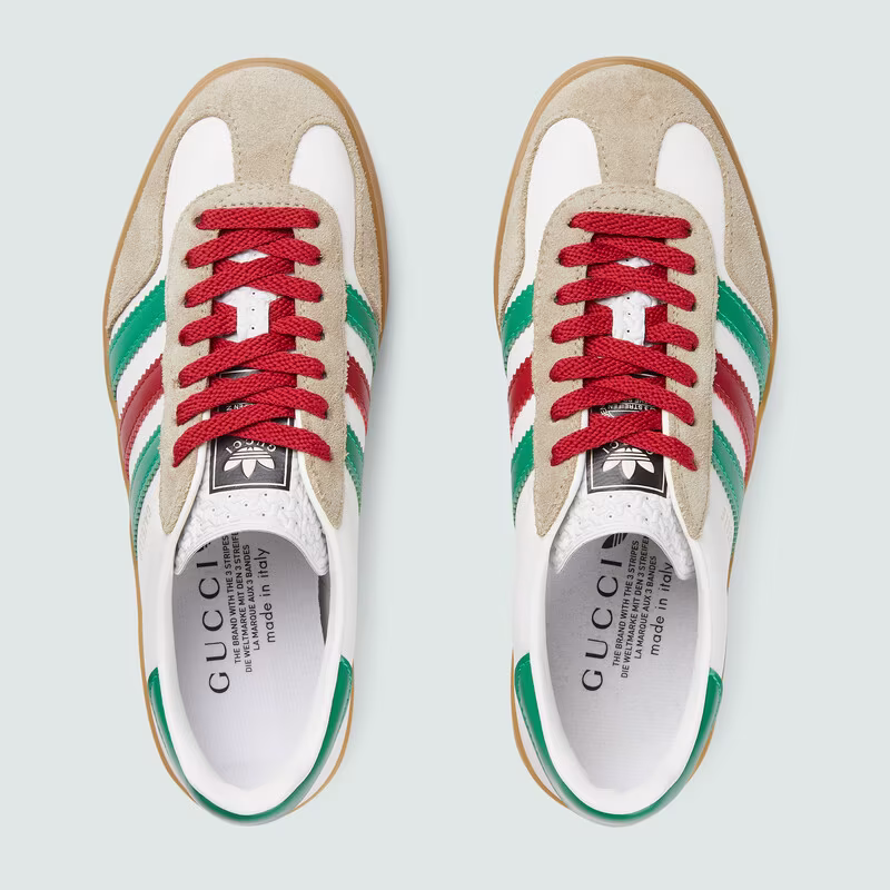adidas and Gucci venture into a collection, where the Web juxtaposes with the three white stripes, and the GG monogram combines with the trefoil. Inspired by the ‘80s and ‘90s, emblematic House’s motifs mix with those of the historic sportswear brand adidas resulting in a series of hybrid looks. This Gazelle sneaker is enriched with Gucci Trefoil details.