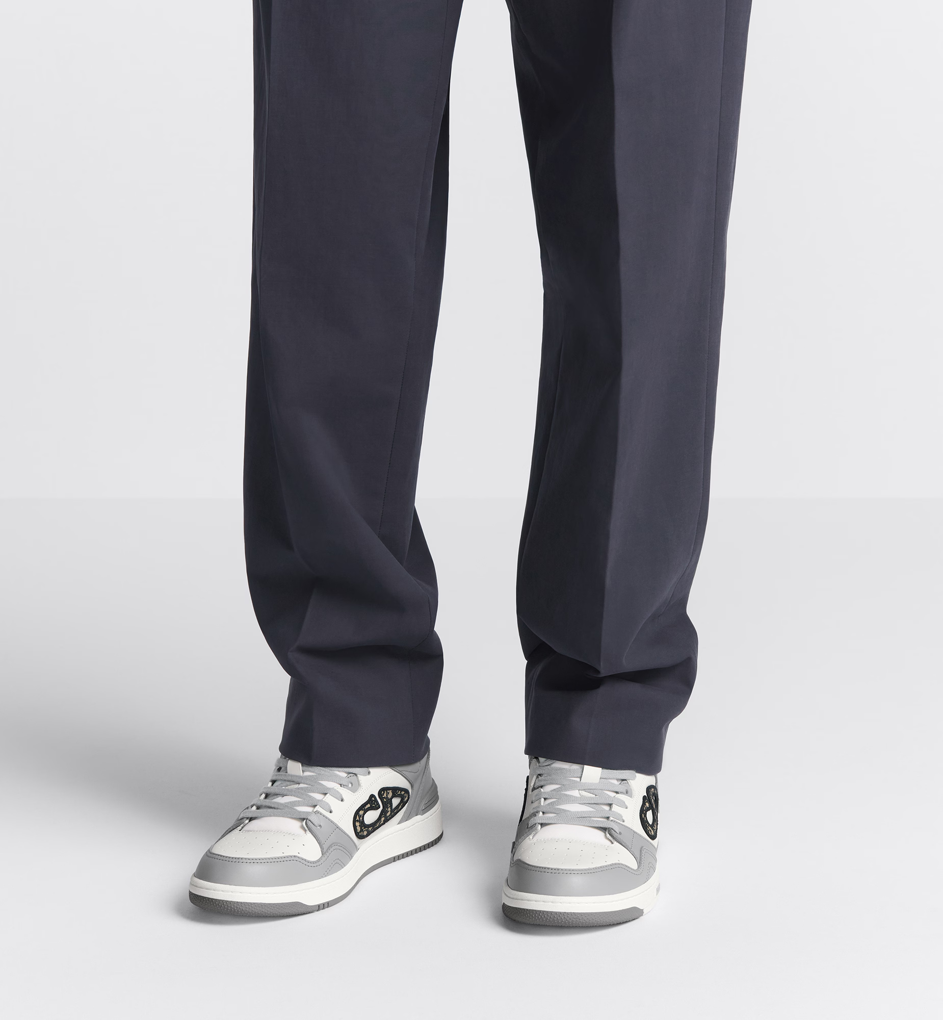 Introduced for Fall 2024, the B57 low-top sneaker is a new House essential. Crafted in Dior gray and white smooth calfskin, the style is adorned with a beige and black Dior Oblique jacquard CD signature on the sides. The sneaker is enhanced by various hallmark details on the tongue, sole and rear, while perforated detailing, topstitching and a rubber insert accentuate its athletic appeal. Completed by a two-tone rubber sole, the sneaker will elevate any favorite outfit.