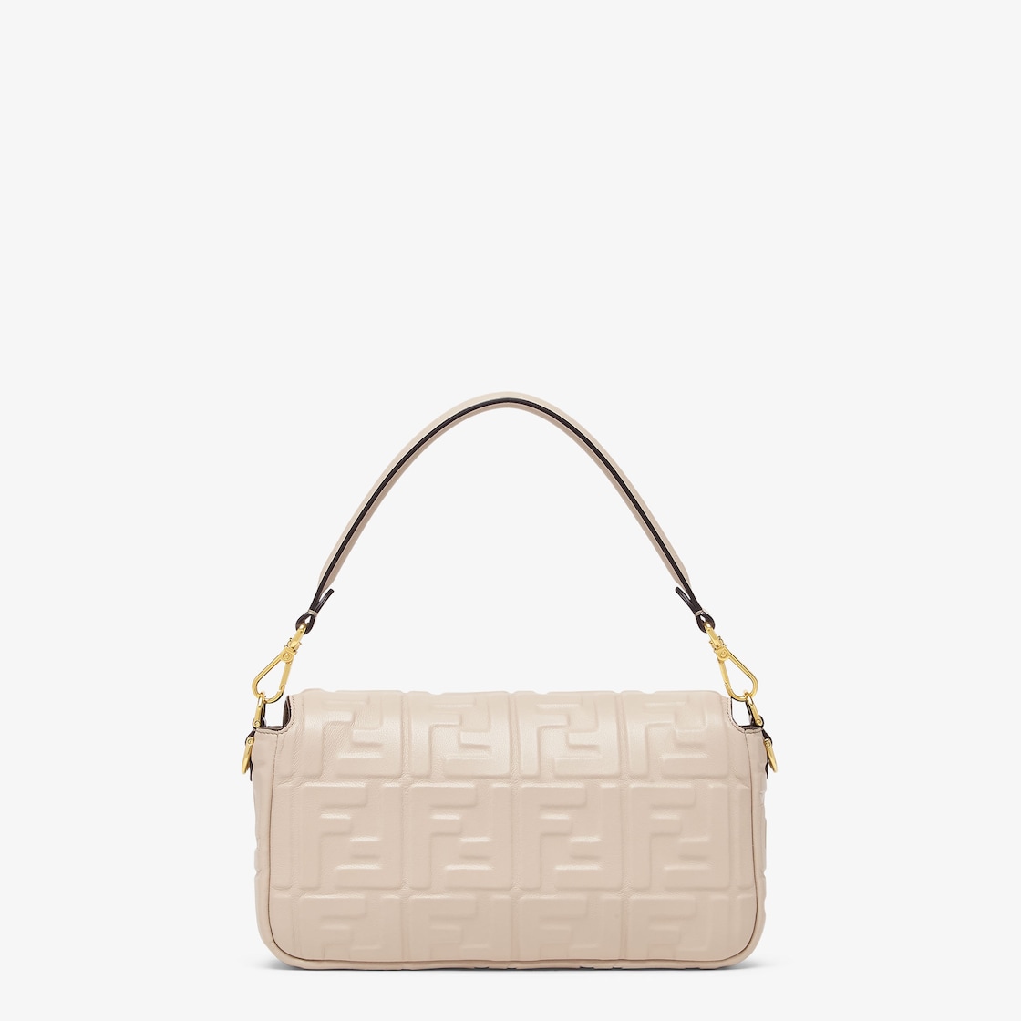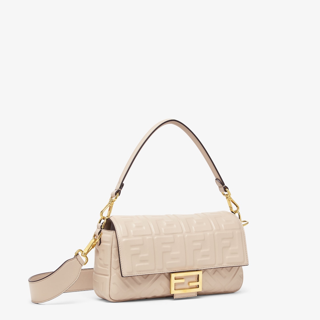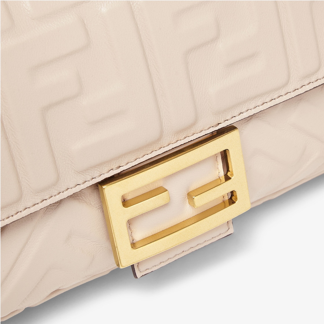 Iconic medium Baguette bag made of beige soft nappa leather with a three-dimensional texture embossed FF motif. Decorated with an FF clasp.