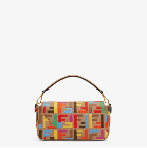 Iconic medium Baguette bag made of beige canvas with a multicolour raised embroidery FF motif, trimmed in tone on tone leather. Decorated with an FF clasp.