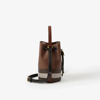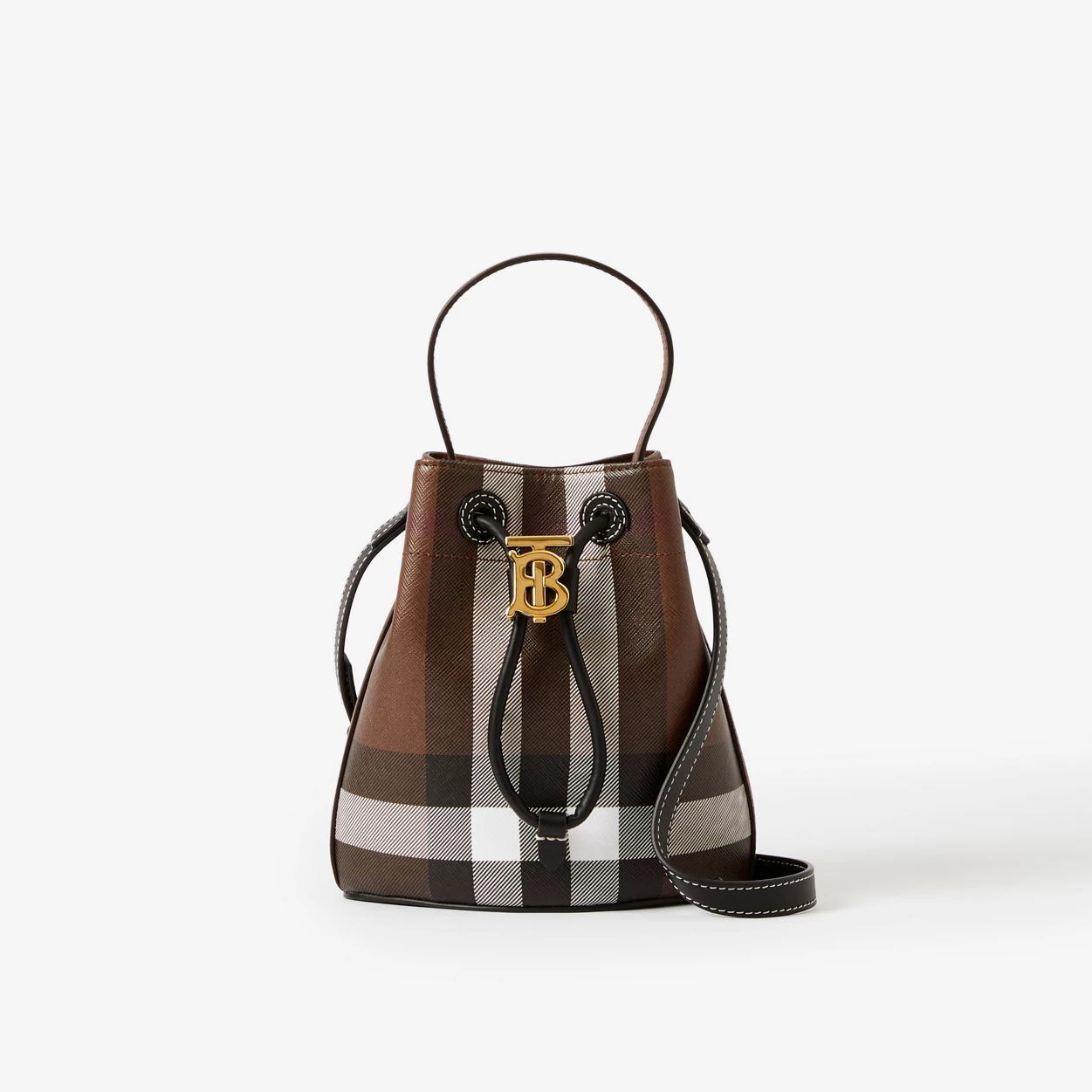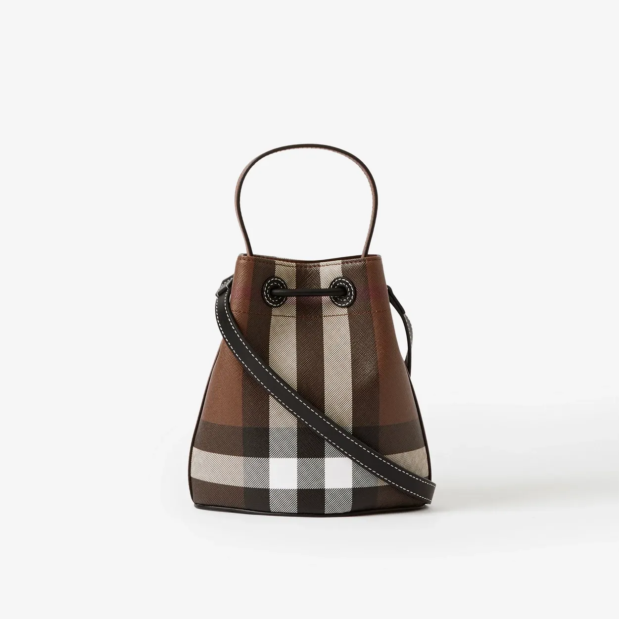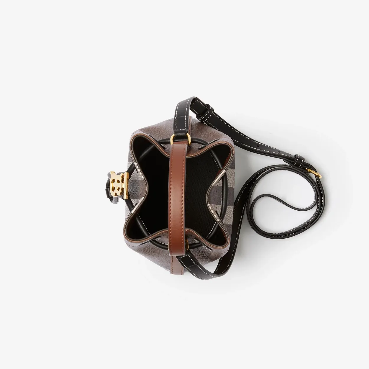 A miniature drawcord bucket bag in our Burberry Check, trimmed with leather. A fresh addition to the TB family, the design is styled with an adjustable crossbody strap. The main material of this product is made with at least 30% bio-based materials. Bio-based materials are derived from renewable natural resources such as plants and castor oil.