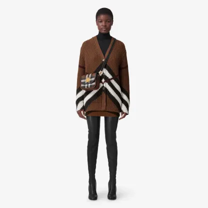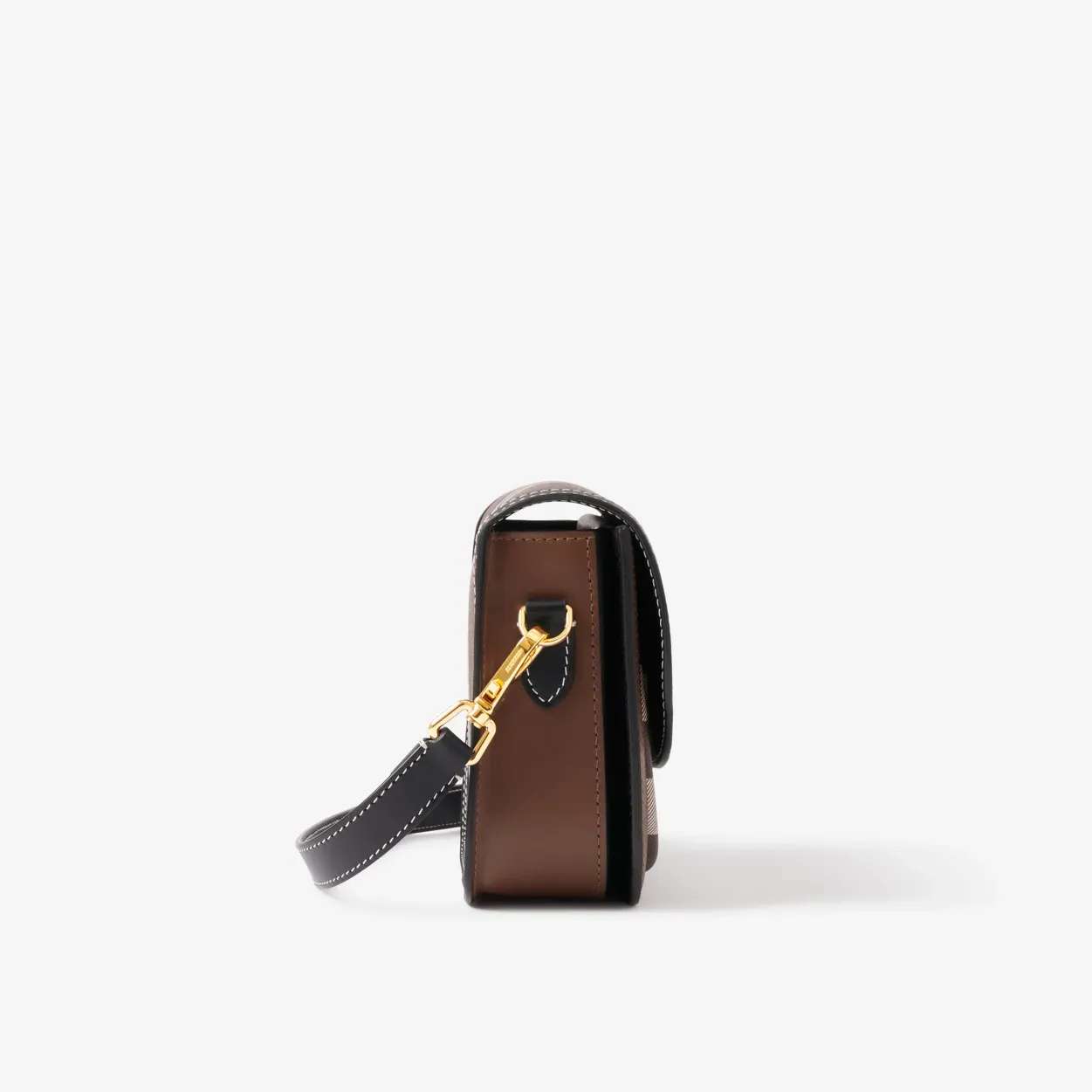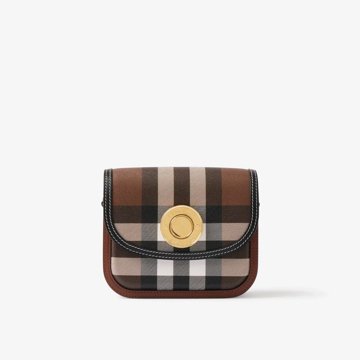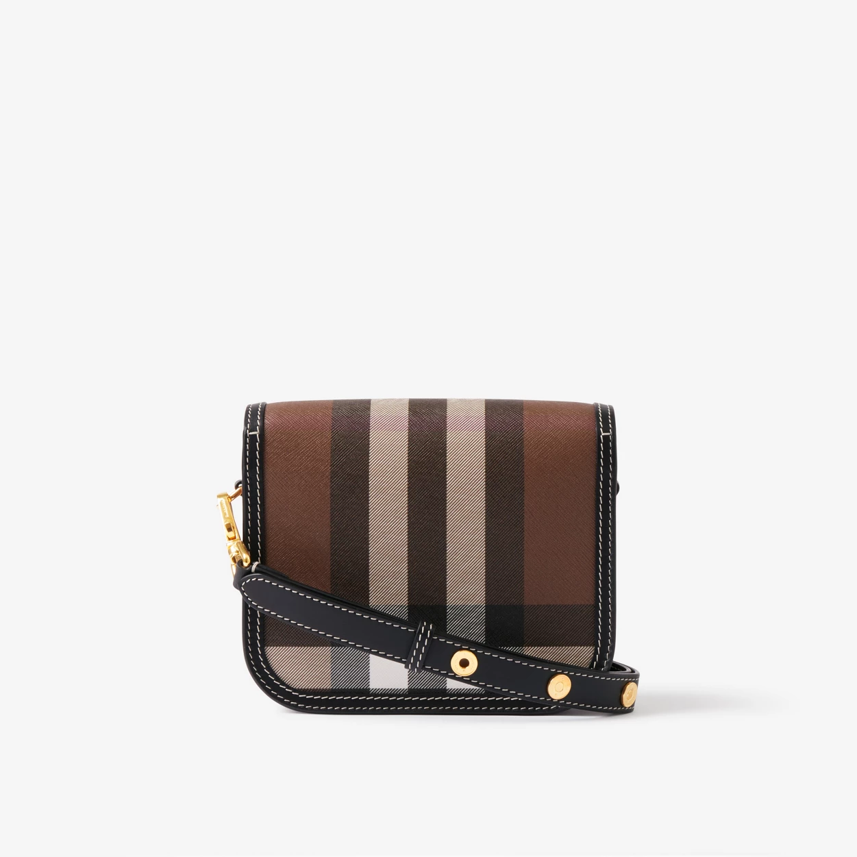 A compact satchel in Exaggerated Check and topstitched leather, sculpted with a reinforced front panel to preserve its elegant curves. The design is accented with gold-plated logo-engraved eyelets and a push-button closure in the shape of our logo graphic. In a nod to our history, the style shares its name with Thomas Burberry’s mother, sister and first-born daughter. Carry crossbody or on the shoulder using the detachable, adjustable strap. The main material of this product is made with at least 30% bio-based materials. Bio-based materials are derived from renewable natural resources such as plants and castor oil.