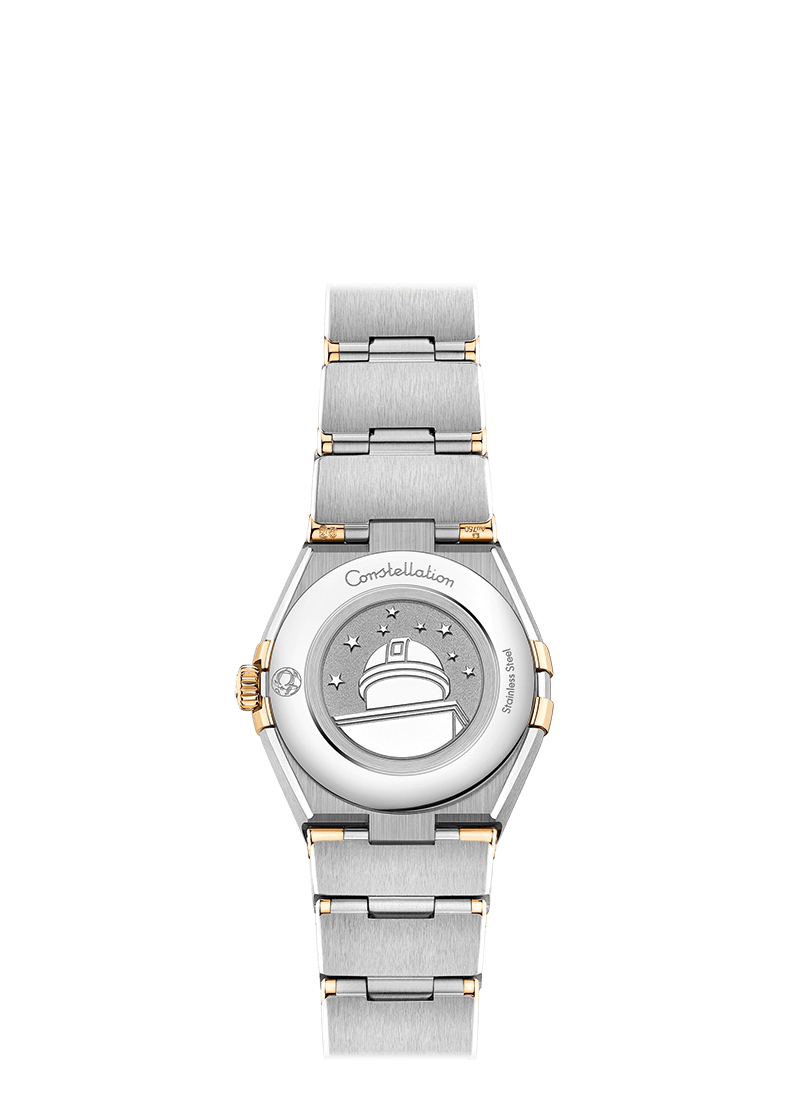 This 25 mm 18K yellow gold and stainless steel model features a bezel engraved with Roman numerals, crystal white silvery dial and scratch-resistant saphire crystal. The hands, OMEGA logo, Constellation star and indexes are also in 18K yellow gold.