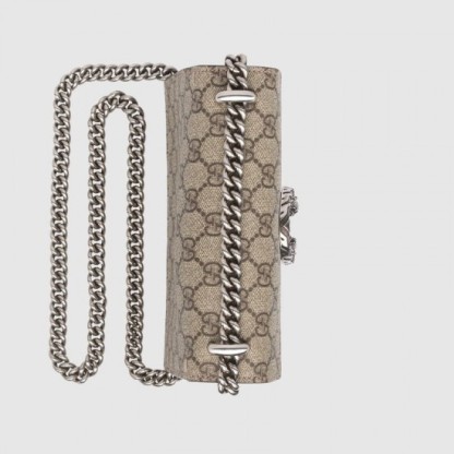Beige/ebony GG Supreme canvas, a material with low environmental impact, with taupe suede trimAntique silver-toned hardwareTiger head closureHand-painted edgesHand-stitched detailsPocket under the flapPin closure with side releaseSliding chain strap can be worn as a shoulder strap with 15.5″ drop or can be worn as a top handle with 9″ dropWeight: .45kg approximatelyMini size: 7.5″W x 6″H x 2″DMade in ItalyThe model is 5’10”