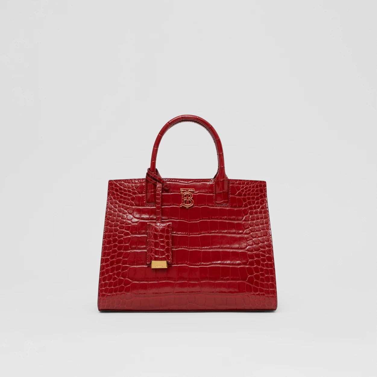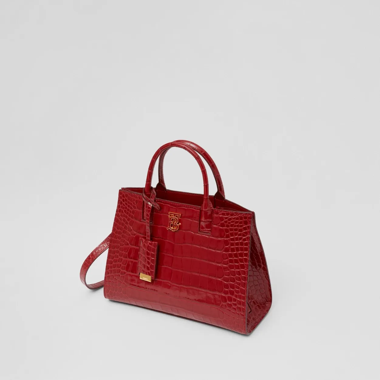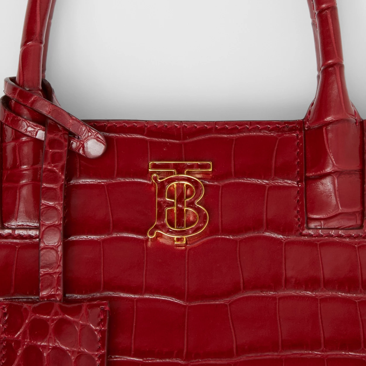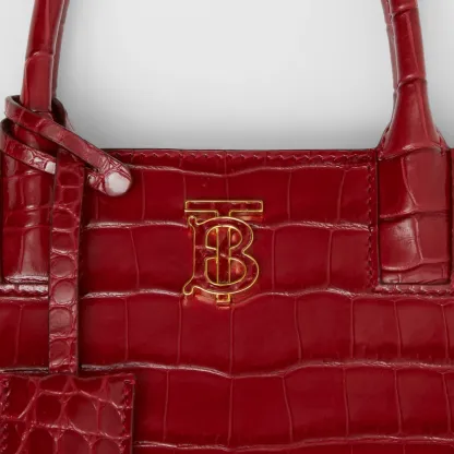 A structured tote in Italian-tanned crocodile-effect embossed leather, punctuated with a polished Thomas Burberry Monogram. The compact design features multiple pockets and a leather-wrapped mirror charm. Carry in hand or by the detachable shoulder strap.