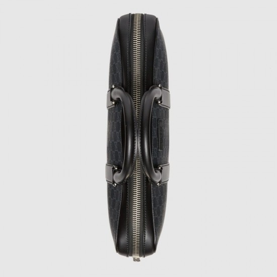 The GG motif in a distinct black/grey combination is further enriched with the Web strap and black leather trims. The slim briefcase is secured with a double zipper closure.