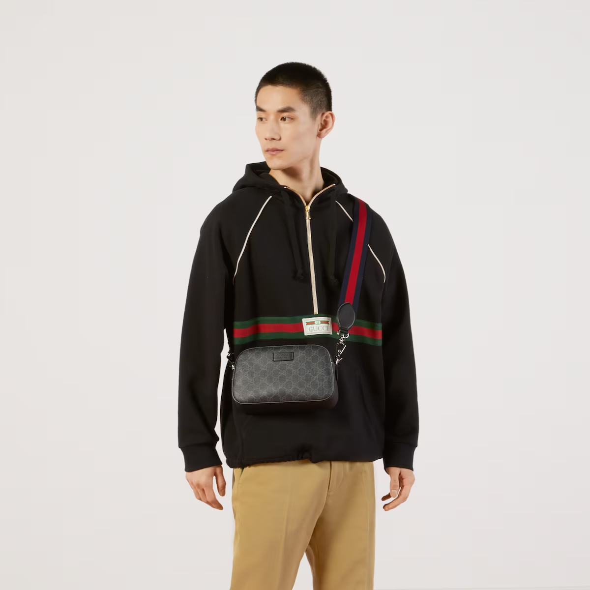 The small crossbody bag, designed with a softly structured rectangular shape that recalls traditional camera cases, in GG Supreme canvas. Presented in the black and grey combination of the House motif, the bag is completed with a wide nylon stripe in blue and red Web.