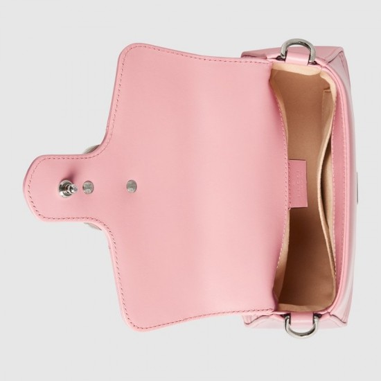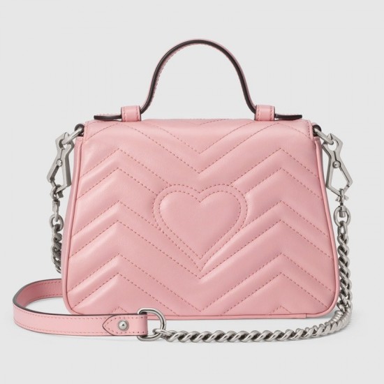 Presented in a light pink shade, the mini GG Marmont top handle bag has a softly structured shape and a flap closure with Double G hardware. The bag is equipped with a leather top handle and chain shoulder strap for added comfort and multifunctional use. Made in matelassé chevron leather with a heart on the back, pastels push the color focus throughout the Pre-Fall 2020 collection, in soft, vibrant hues.