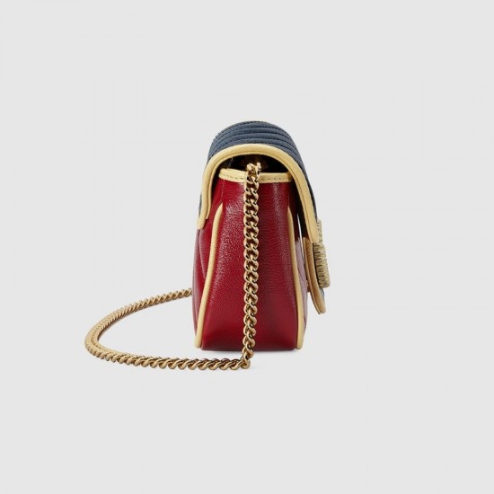 Blue and dark red diagonal matelassé leatherButter leather trimGold-toned hardwareTextured torchon Double GDetachable key ringDetachable chain strap with 23.6″ dropMagnetic closureWeight: .325kg approximately Super mini size: 6.8″W x 4.5″H x 1.5″DViscose liningMade in Italy