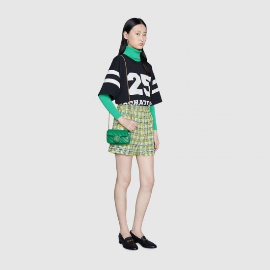 The GG Marmont super mini bag is introduced in matelassé leather in shades of green. The style is completed with the line's signature Double G hardware—enriched with enamel. Miniature versions of signature styles appear throughout the Ouverture collection adding a contemporary feel.