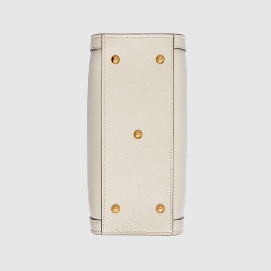 Combining recognizable elements of the House, the mini tote bag is defined by its bamboo handles and Double G hardware. Crafted from white leather, the accessory is further accentuated by two neon bands, a playful reference to the bands used to keep handles in shape.