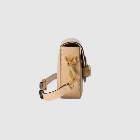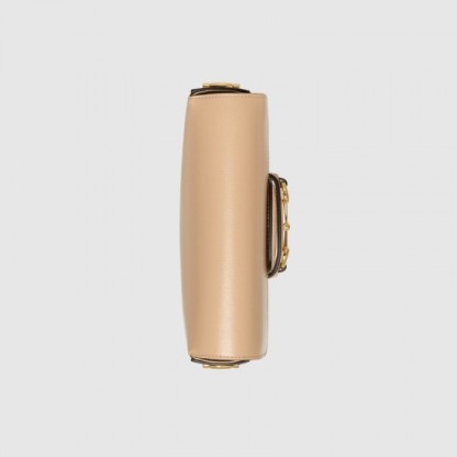 Petite versions of the Gucci Horsebit 1955 add a hybrid twist to the vintage inspired line. Enriched with two different shoulder straps, the beige leather mini bag’s character transforms from understated elegance with a tonal leather strap to a strong logo feel thanks to a red and green Web option.