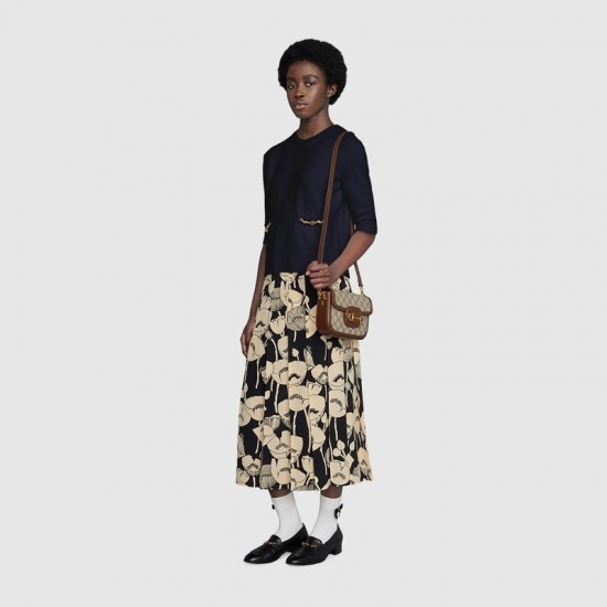Petite versions of the Gucci Horsebit 1955 add a hybrid twist to the vintage inspired line. Enriched with two different shoulder straps, the mini bag’s character transforms from understated elegance with a tonal leather strap to a strong logo feel thanks to a red and green Web option. The accessory is presented in monogram canvas with a brown leather trim.