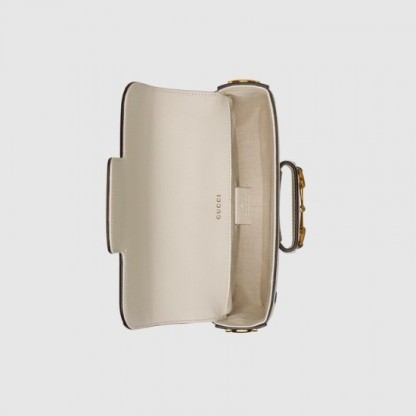 Petite versions of the Gucci Horsebit 1955 add a hybrid twist to the vintage inspired line. Enriched with two different shoulder straps, the mini bag’s character transforms from understated elegance with a tonal leather strap to a strong logo feel thanks to a red and green Web option. The accessory is presented in monogram canvas with a white leather trim.