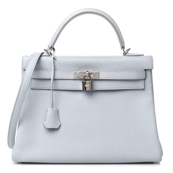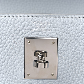 This is an authentic HERMES Taurillon Clemence Kelly Retourne 32 in Bleu Glacier. This Kelly handbag is crafted of supple, textured calfskin leather. The bag features a leather top handle with polished palladium plated hardware links, an optional shoulder strap, a crossover flap and a strap closure with a signature palladium plated Kelly turn lock and a clochette for the keys to the padlock. The flap opens to a matching goatskin leather interior with zipper and flat pockets.