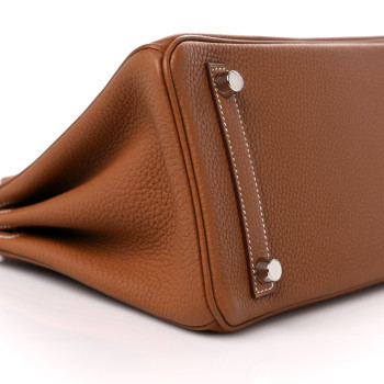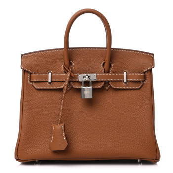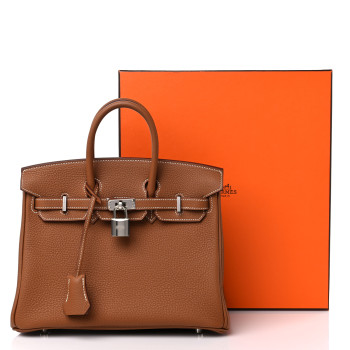 This is an authentic HERMES Togo Birkin 25 in Gold. This classic handbag is beautifully crafted of togo calfskin leather in light golden brown. The bag features rolled leather top handles, a short front flap and strap closure, and palladium hardware. This opens to a goatskin leather interior with pockets.