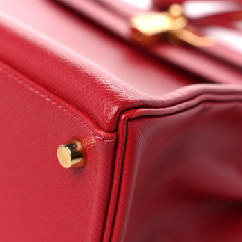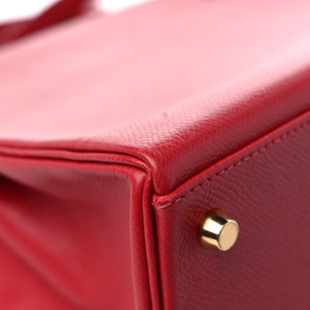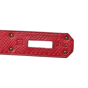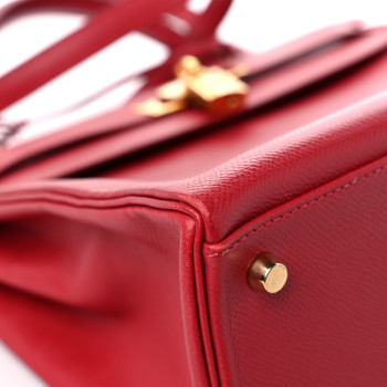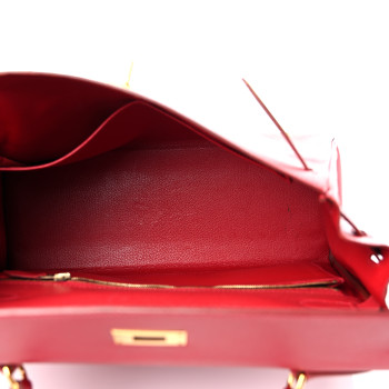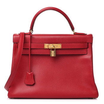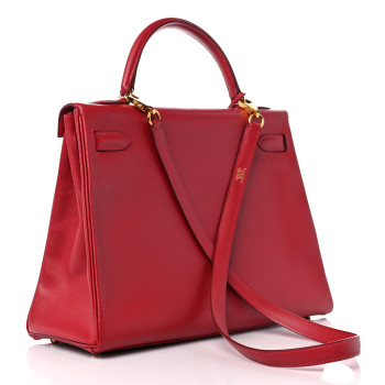 This is an authentic HERMES Courchevel Kelly Retourne 32 in Rouge Vif. This stunning Hermes classic handbag is beautifully crafted of calfskin leather in red. The bag features a reinforced leather top handle, an optional leather shoulder strap, gold plated hardware, a strap closure with a signature Kelly turn lock and a hanging clochette for keys. The flap opens to a goatskin leather interior with zipper and patch pockets.
