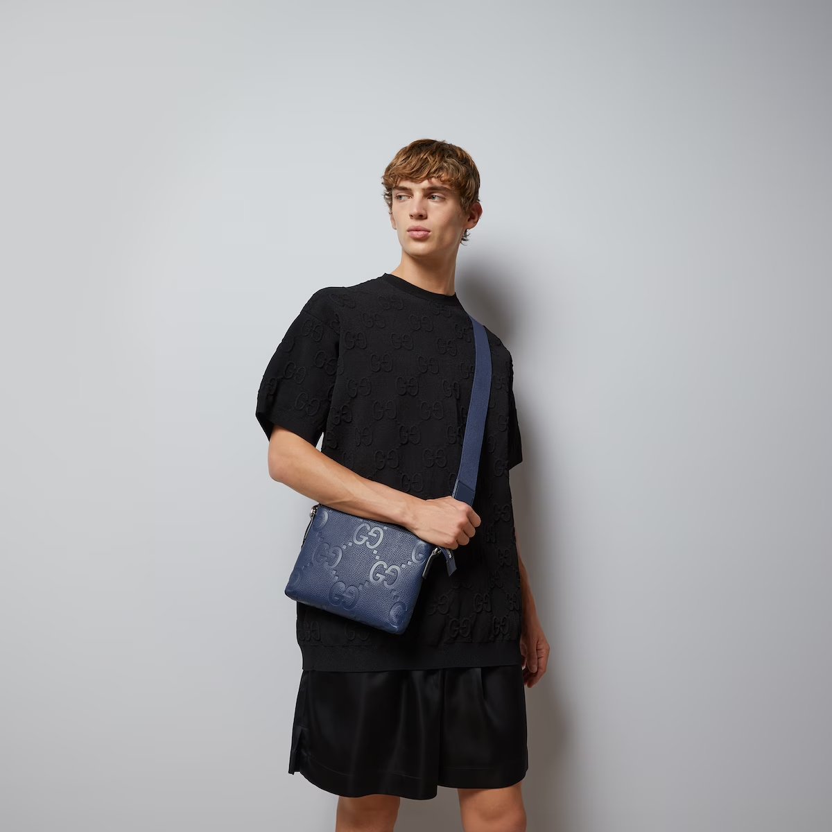 The jumbo GG continues to enrich the latest collections with a maxi version of the House logo. For Spring Summer 2024 the well-known motif in blue speaks to the start of the warmer season. Here it defines this small messenger bag with an inside zip pocket.