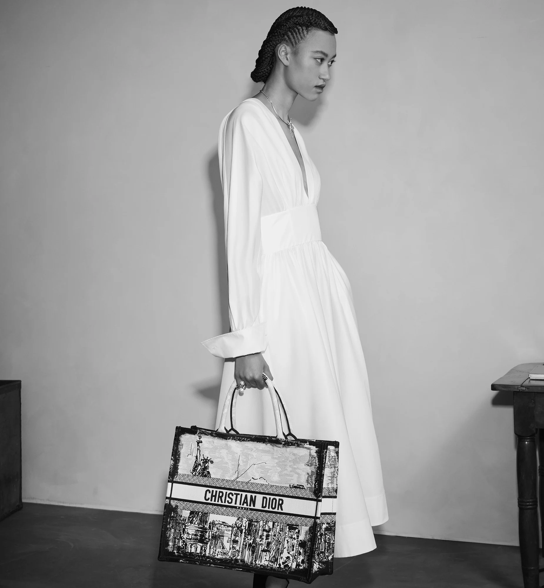 Introduced by Maria Grazia Chiuri, Creative Director of Christian Dior, the Dior Book Tote has become a staple of the Dior aesthetic. Designed to hold all the daily essentials, it is fully embroidered with the white and black New York motif, a pillar of the collection that celebrates the city's skyline and the Statue of Liberty in a graphic spirit. Adorned with a contrasting Christian Dior Paris signature on the front, the large tote exemplifies the House's savoir-faire and may be carried by hand.