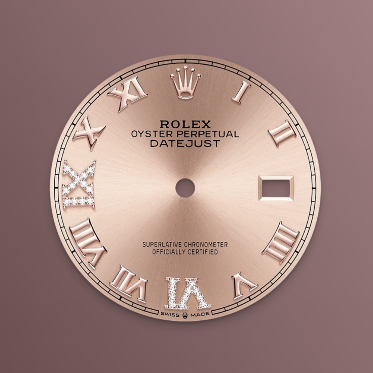 The dial features Roman numerals VI and IX in 18K gold set with 24 diamonds. Many of the dial styles in the Oyster collection feature sunray effects that reflect an elegant sheen. This effect requires excellent brushing techniques to create engravings that expand from the center of the dial outwards.
