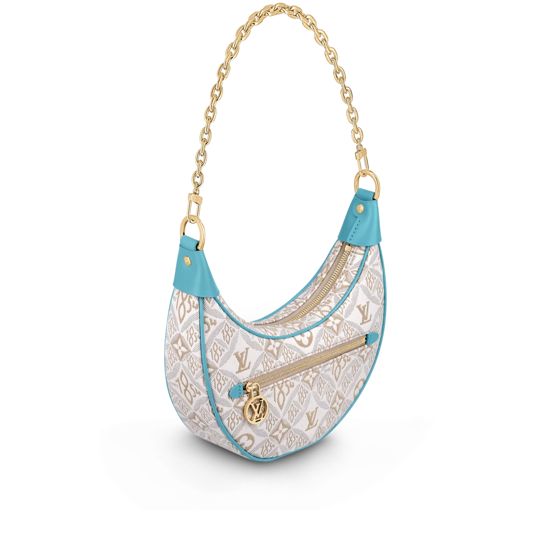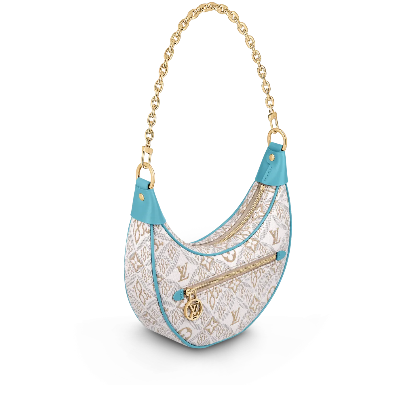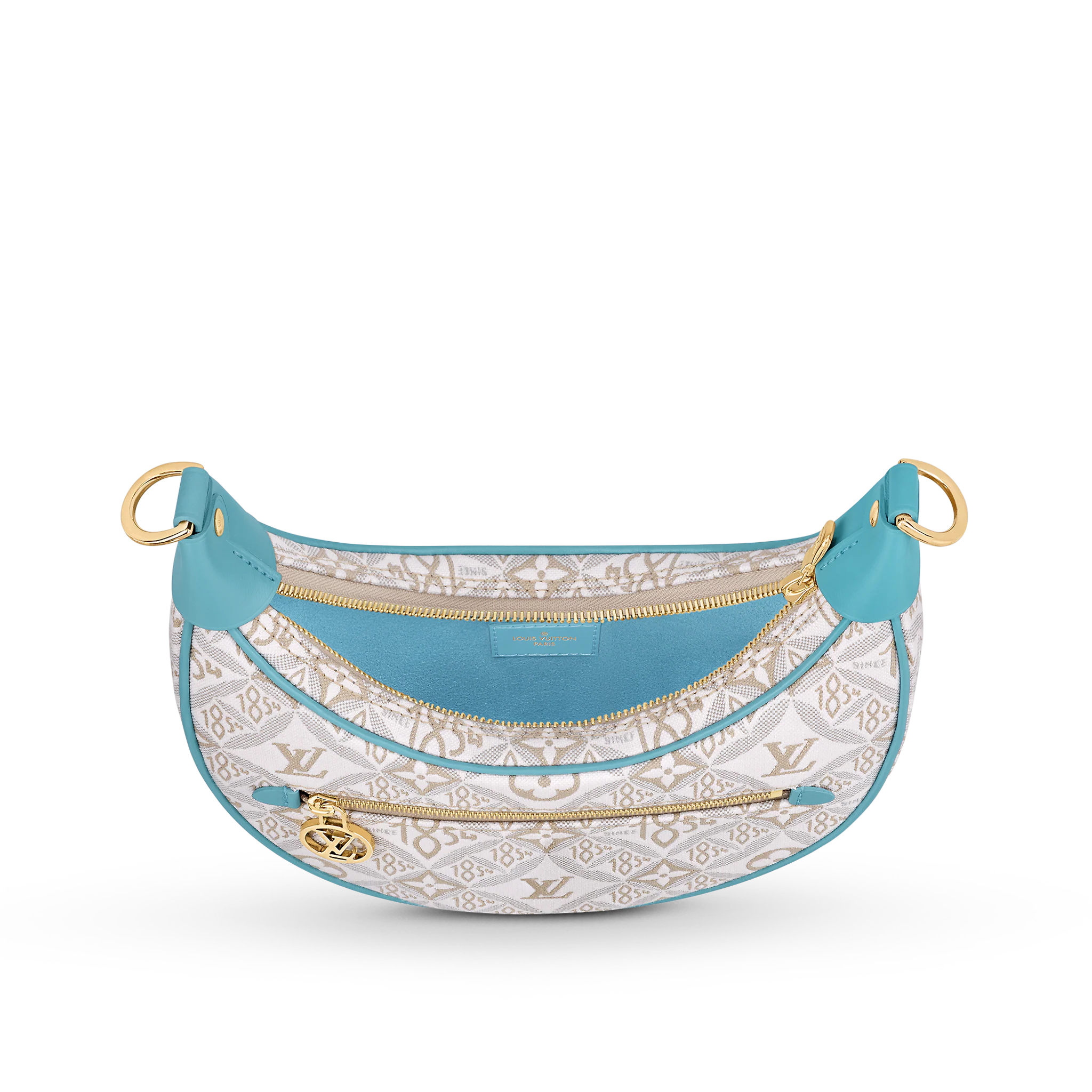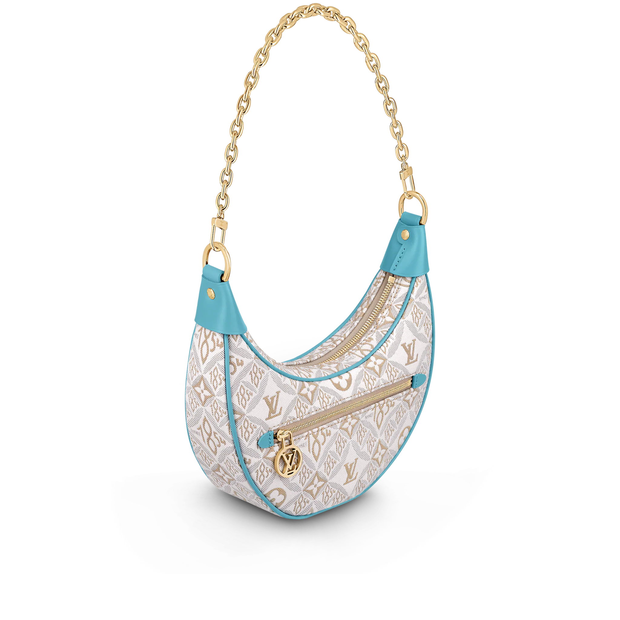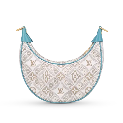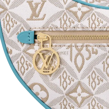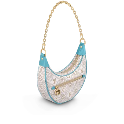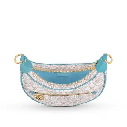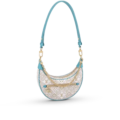 Unveiled by Nicolas Ghesquière at the Cruise 2022 show, the Loop, a half-moon baguette handbag, is made from ecru-colored Since 1854 Jacquard textile and trimmed in light-blue leather. Large enough to carry essentials such as smartphones and wallets, it features a removable gold chain and a front pocket with a LV Circle zip pull.