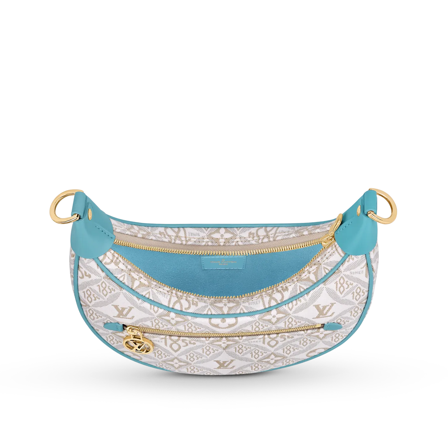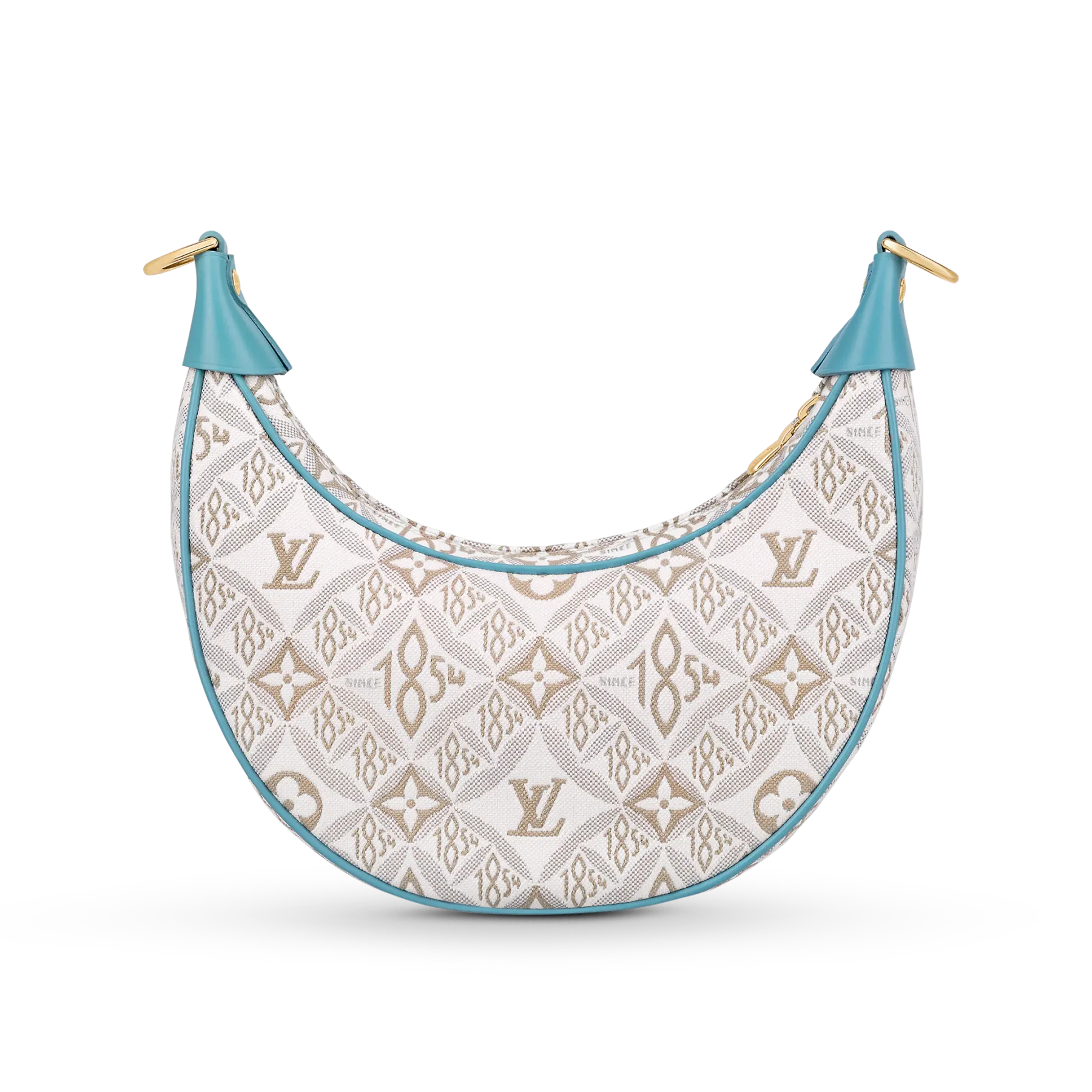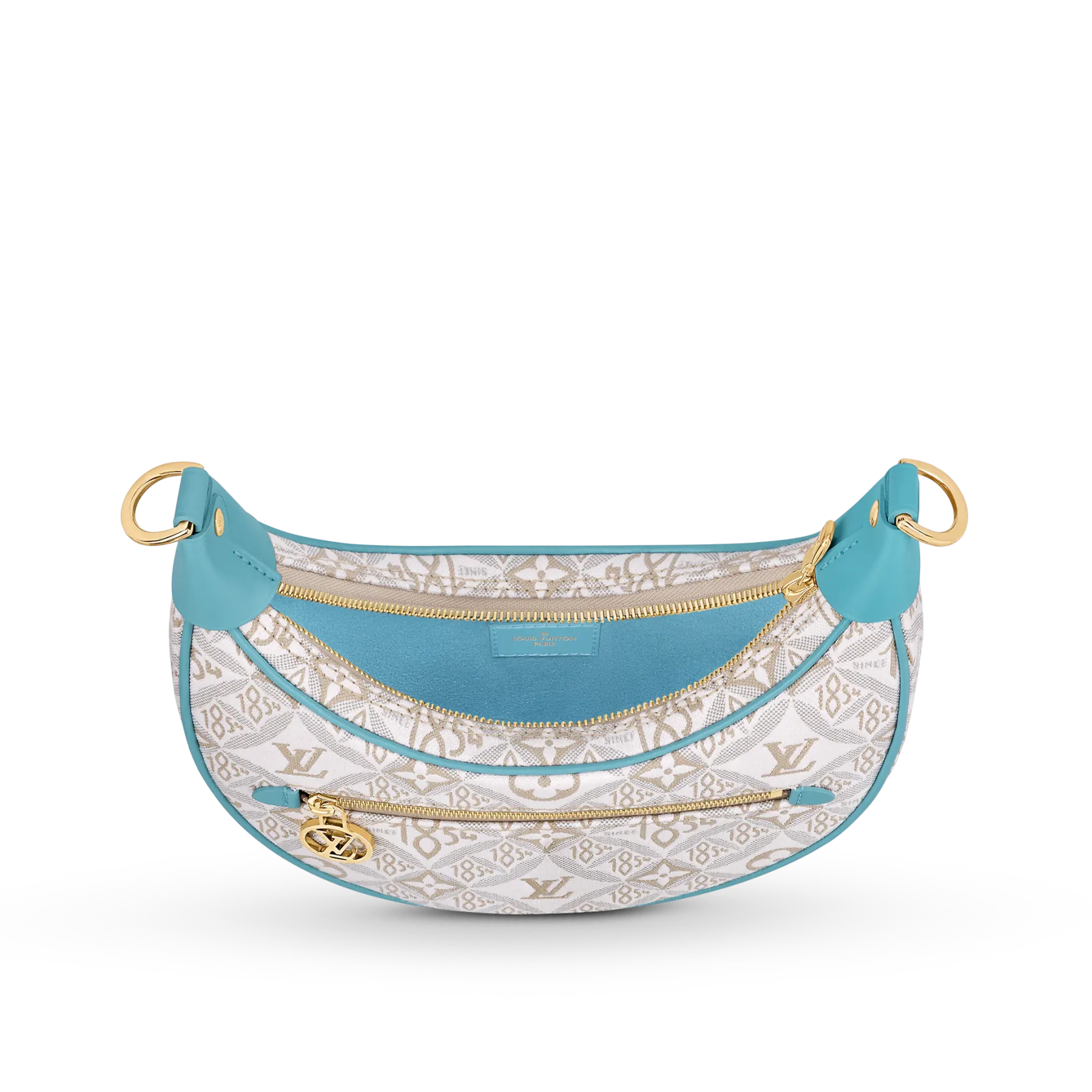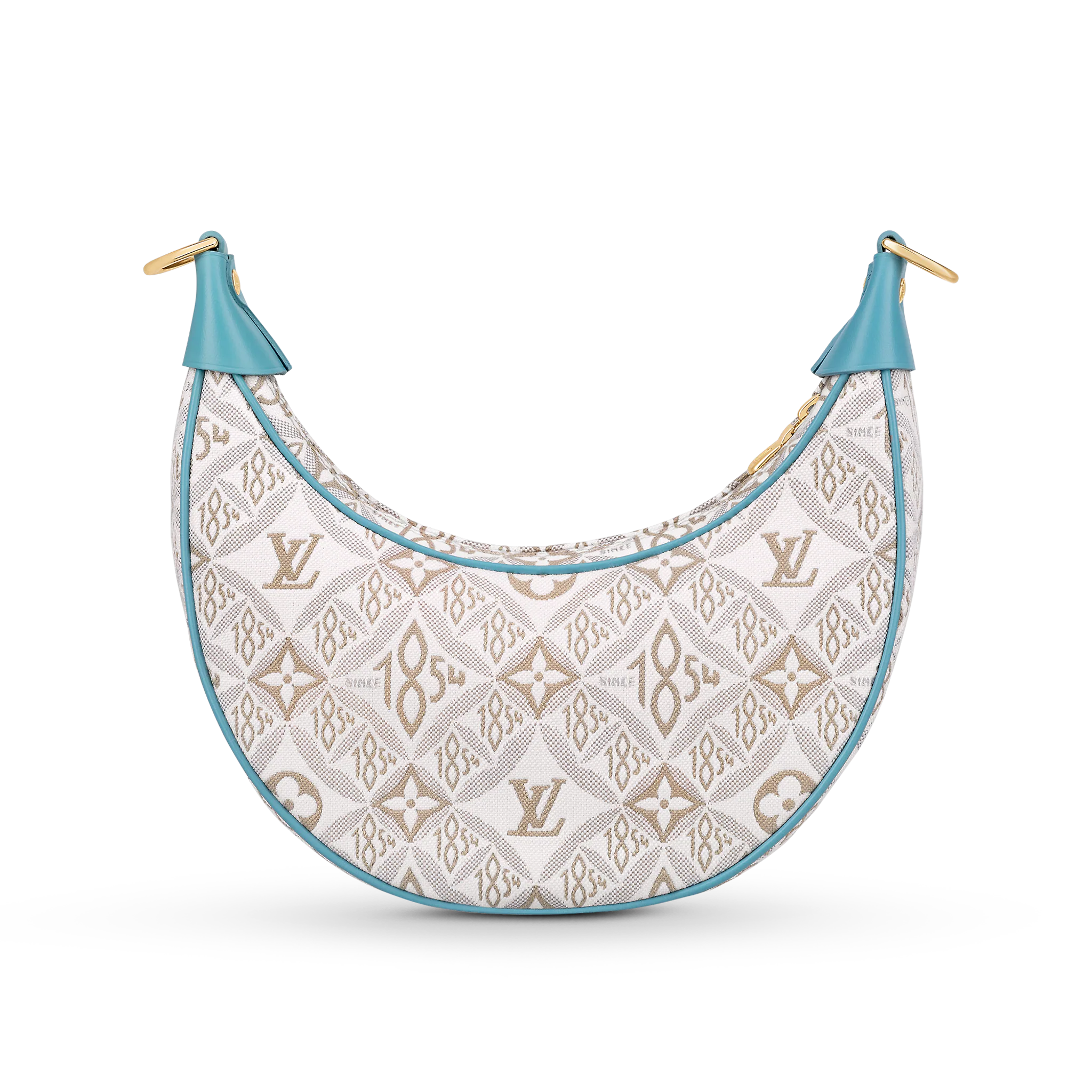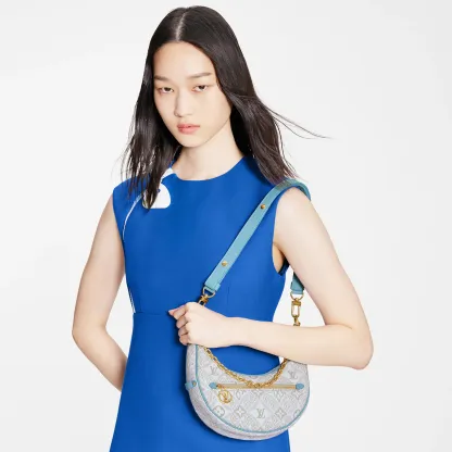 Unveiled by Nicolas Ghesquière at the Cruise 2022 show, the Loop, a half-moon baguette handbag, is made from ecru-colored Since 1854 Jacquard textile and trimmed in light-blue leather. Large enough to carry essentials such as smartphones and wallets, it features a removable gold chain and a front pocket with a LV Circle zip pull.