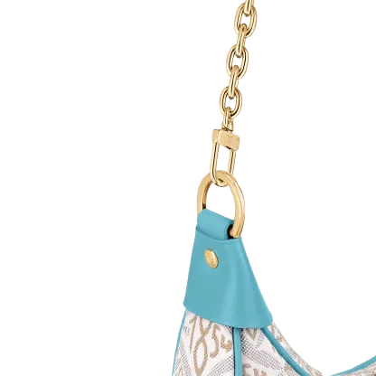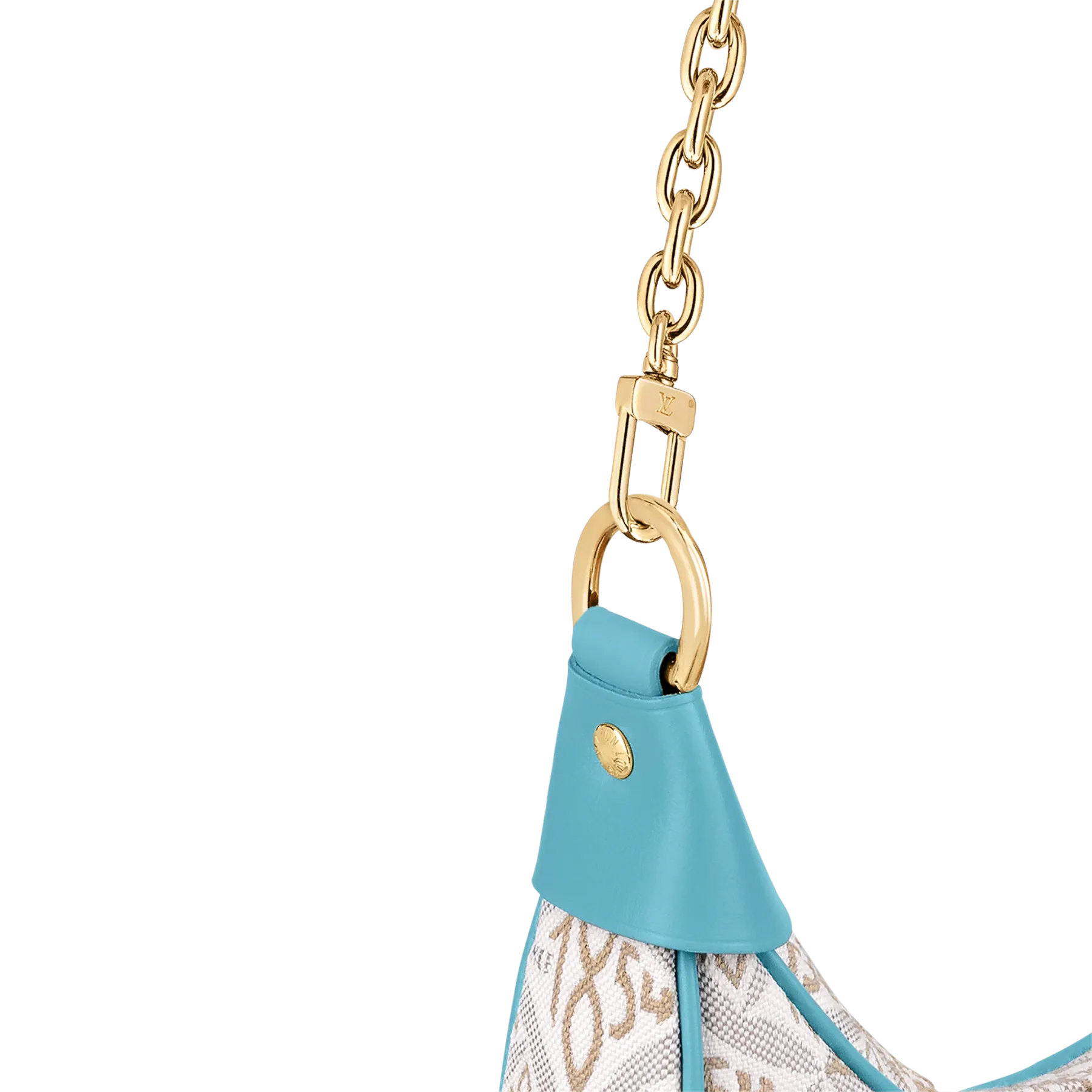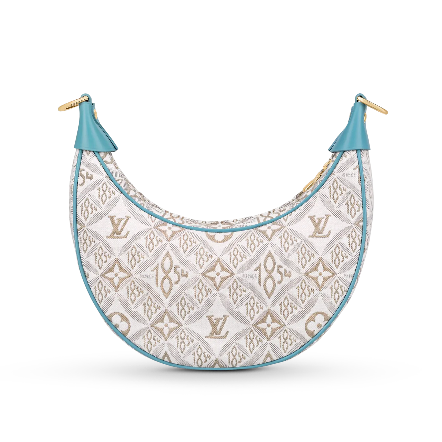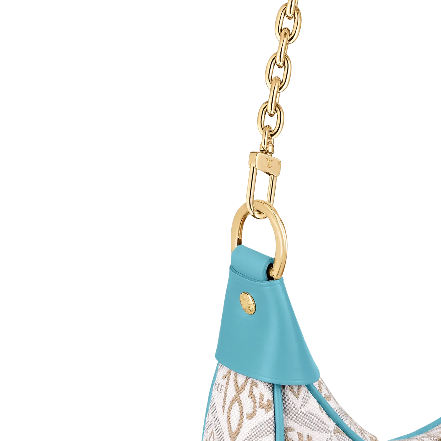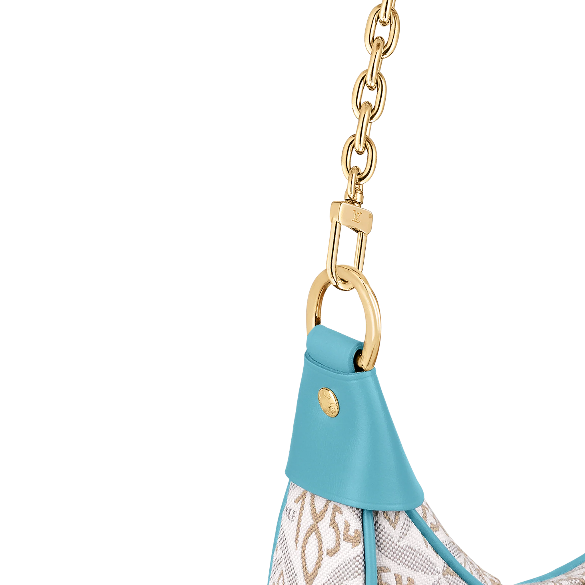 Unveiled by Nicolas Ghesquière at the Cruise 2022 show, the Loop, a half-moon baguette handbag, is made from ecru-colored Since 1854 Jacquard textile and trimmed in light-blue leather. Large enough to carry essentials such as smartphones and wallets, it features a removable gold chain and a front pocket with a LV Circle zip pull.