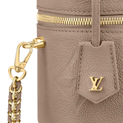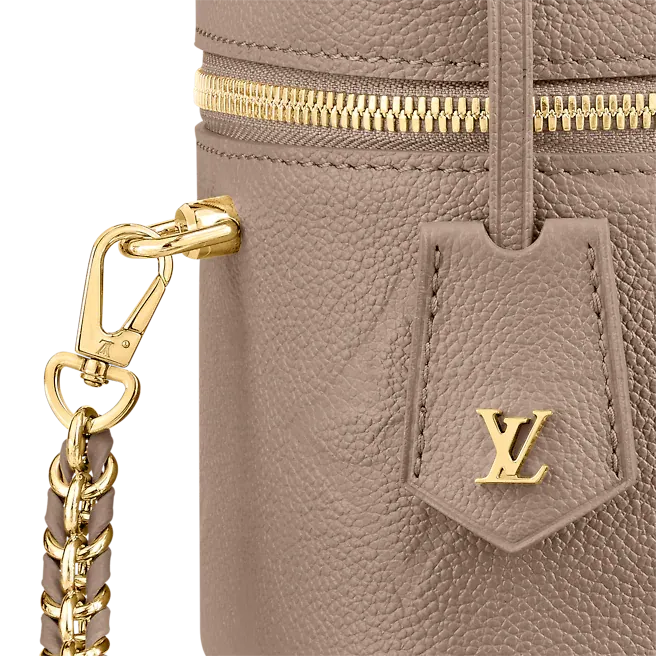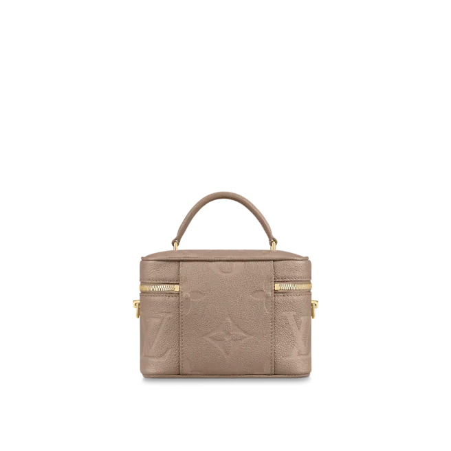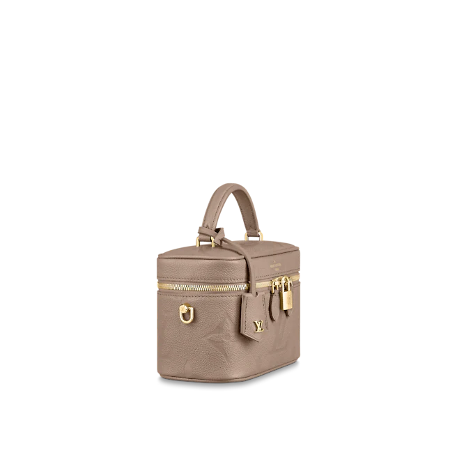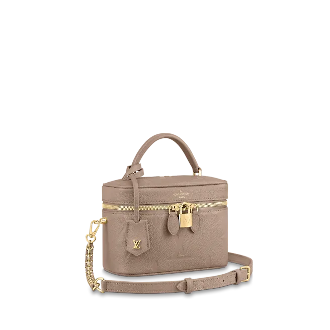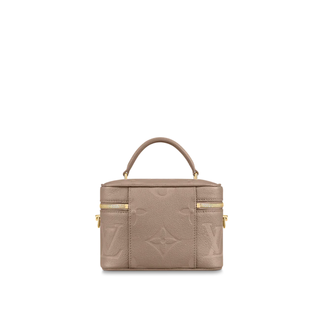With its elegantly modern shape, leather top handle, and subtle embossed Giant Monogram pattern, the Vanity PM handbag is the perfect day-to-evening bag. It features two leather-tassel zip pulls for easy opening and a padlock for secure closure. The adjustable and removable leather strap is adorned with a small chain, interwoven with the leather.