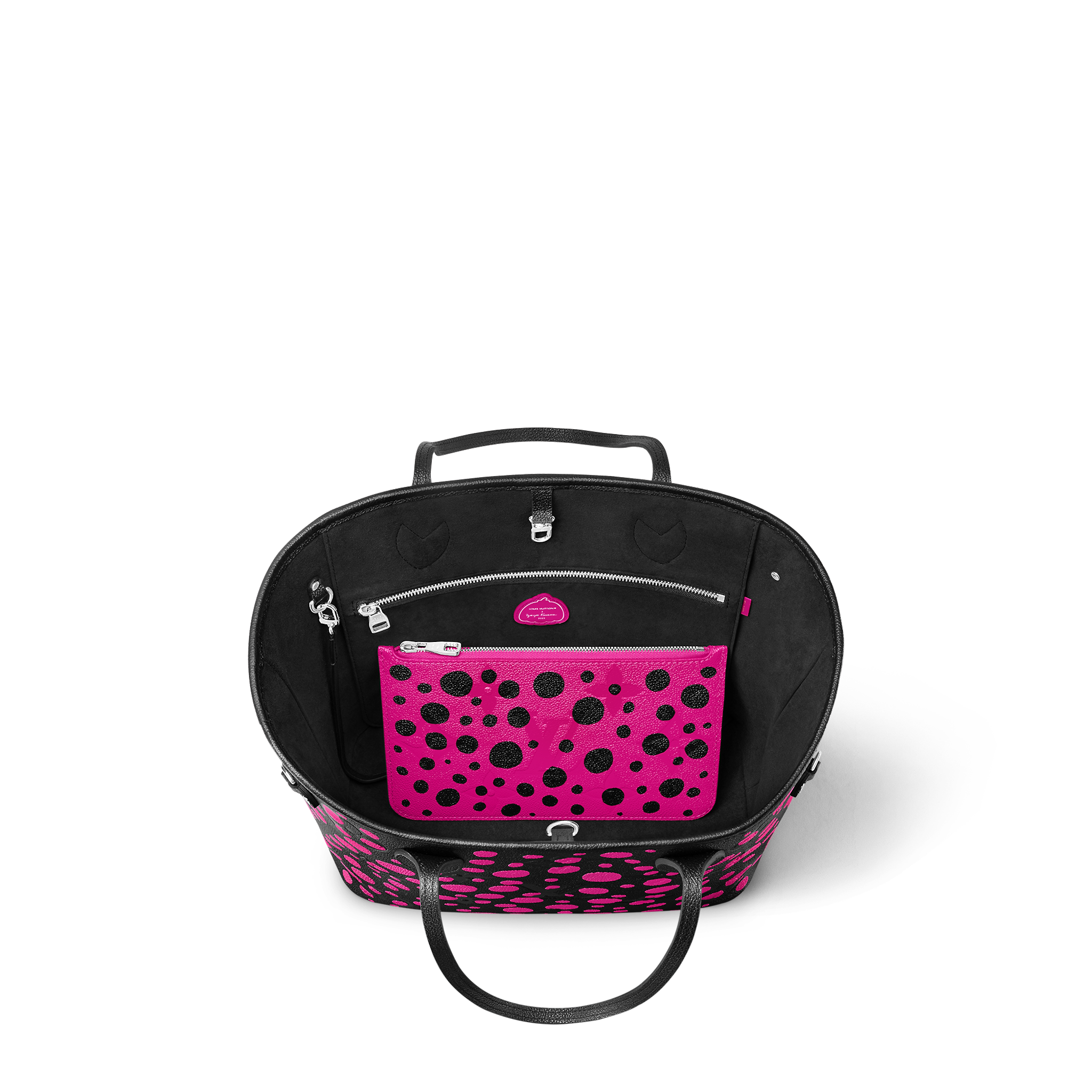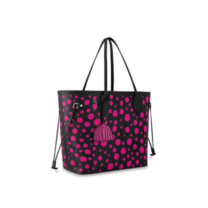 The LVxYK Neverfull MM joins the "Infinity Dots" theme of the major new Louis Vuitton x Yayoi Kusama collection. Endless arrays of dots are the Japanese artist's ultimate visual signature, featured in her paintings, sculptures and performances since the beginning of her career. For this practical, capacious bag, bright fuchsia dots stand out against black Monogram Empreinte cowhide. And it comes with a pumpkin-shaped charm, echoing another of Kusama's emblems.