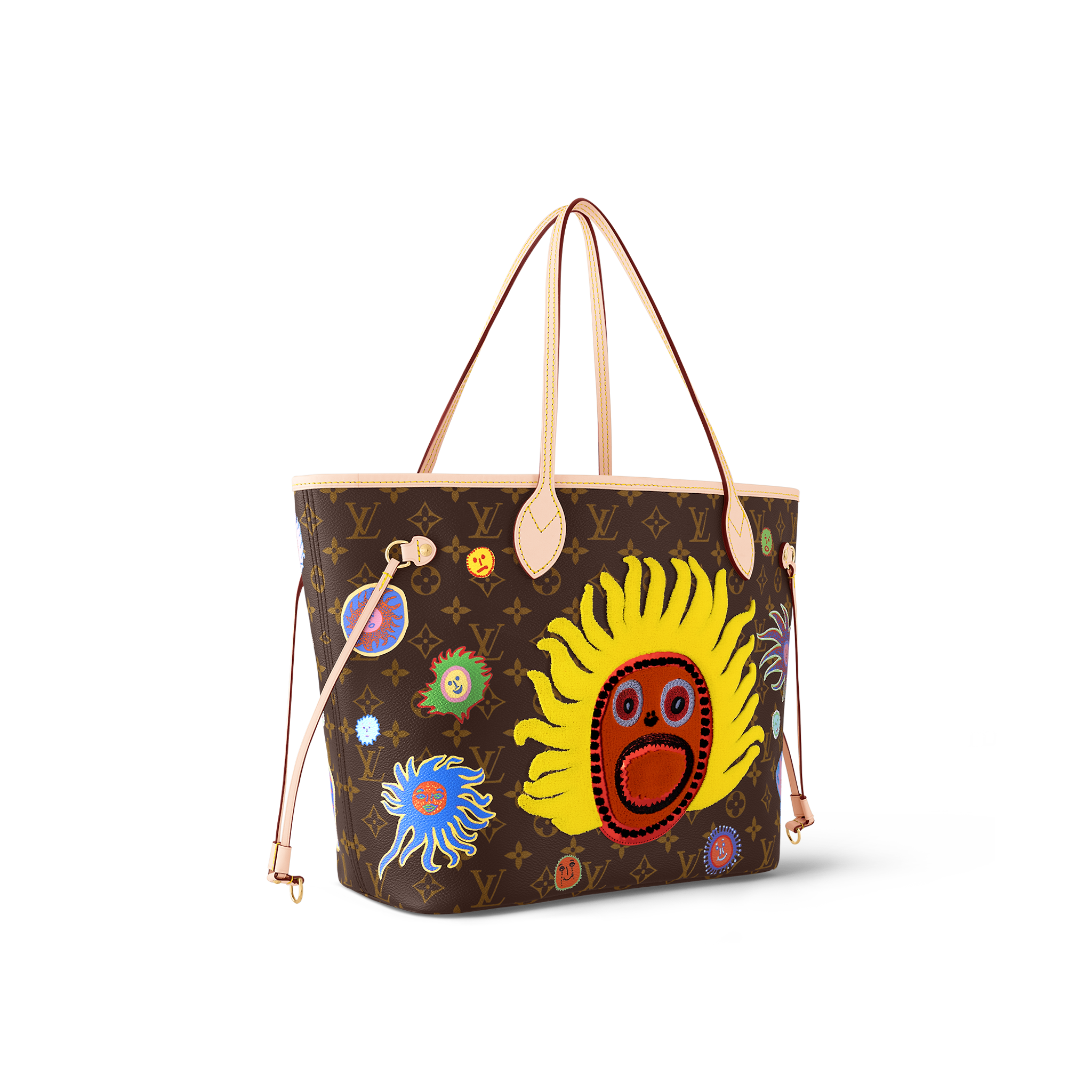 For the "Faces" theme of the new Louis Vuitton x Yayoi Kusama collection, the LVxYK Neverfull MM comes in Monogram canvas emblazoned with images from "My Eternal Soul," a series of paintings that the celebrated Japanese artist began in 2009. A bright red face shouting with joy is surrounded by smaller smiling faces in pulsating colors. A handy city bag, and a collector's item for art lovers and Monogram fans.