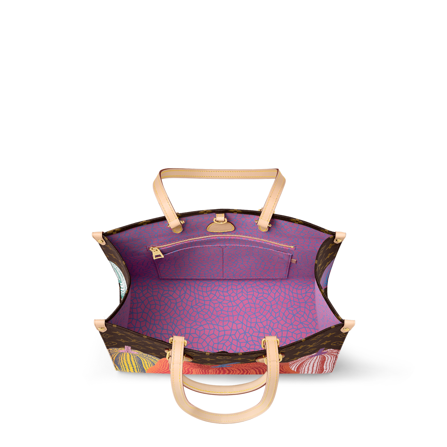 Featured in the exceptional new Louis Vuitton x Yayoi Kusama collection, this version of the LVxYK OnTheGo MM was inspired by a key theme in the celebrated Japanese artist's work: pumpkins, a symbol of comforting warmth. Monogram canvas is printed with a row of stylized pumpkins in cheerful colors, punctuated with Kusama's signature dots. A handy, capacious bag that's sure to become a collector's piece.