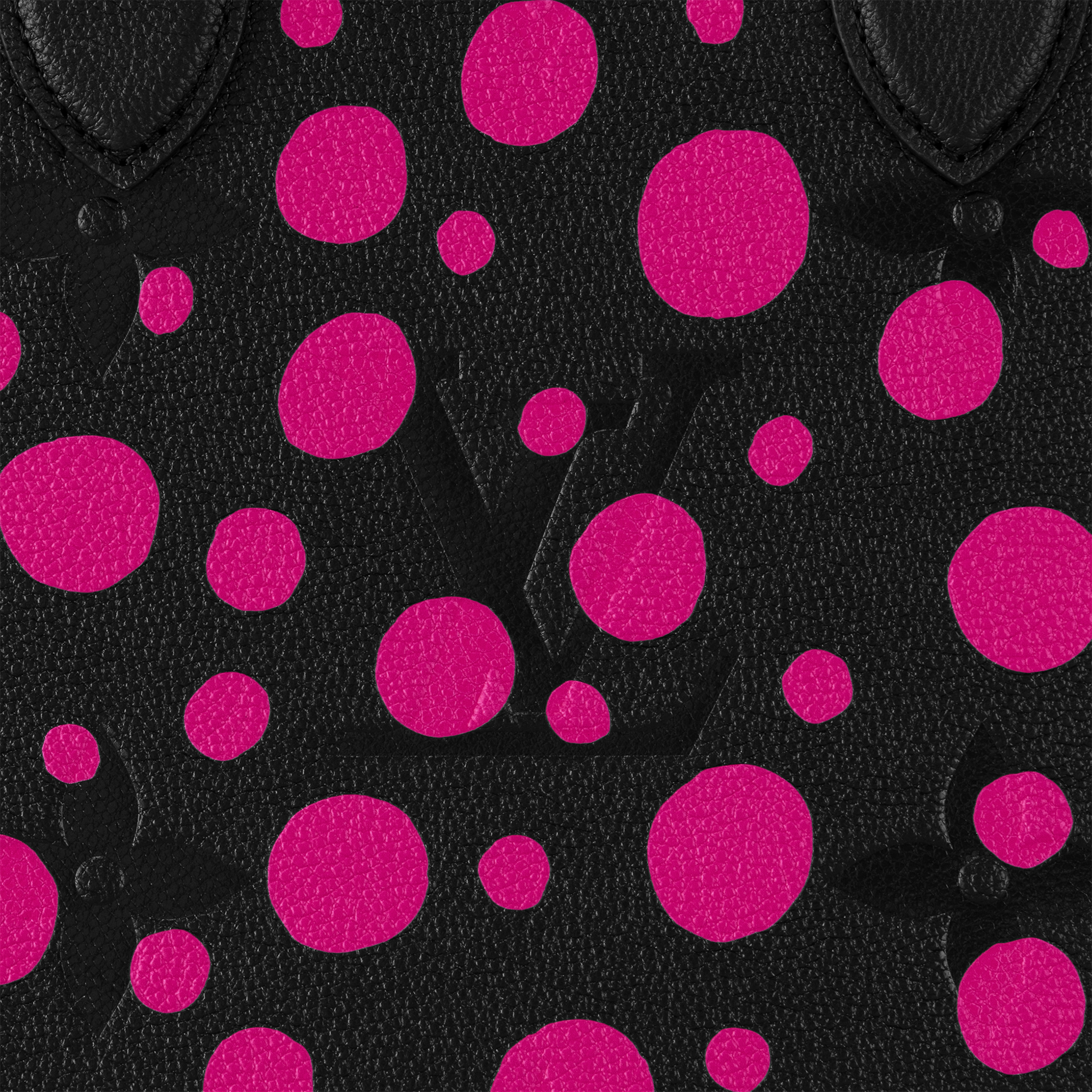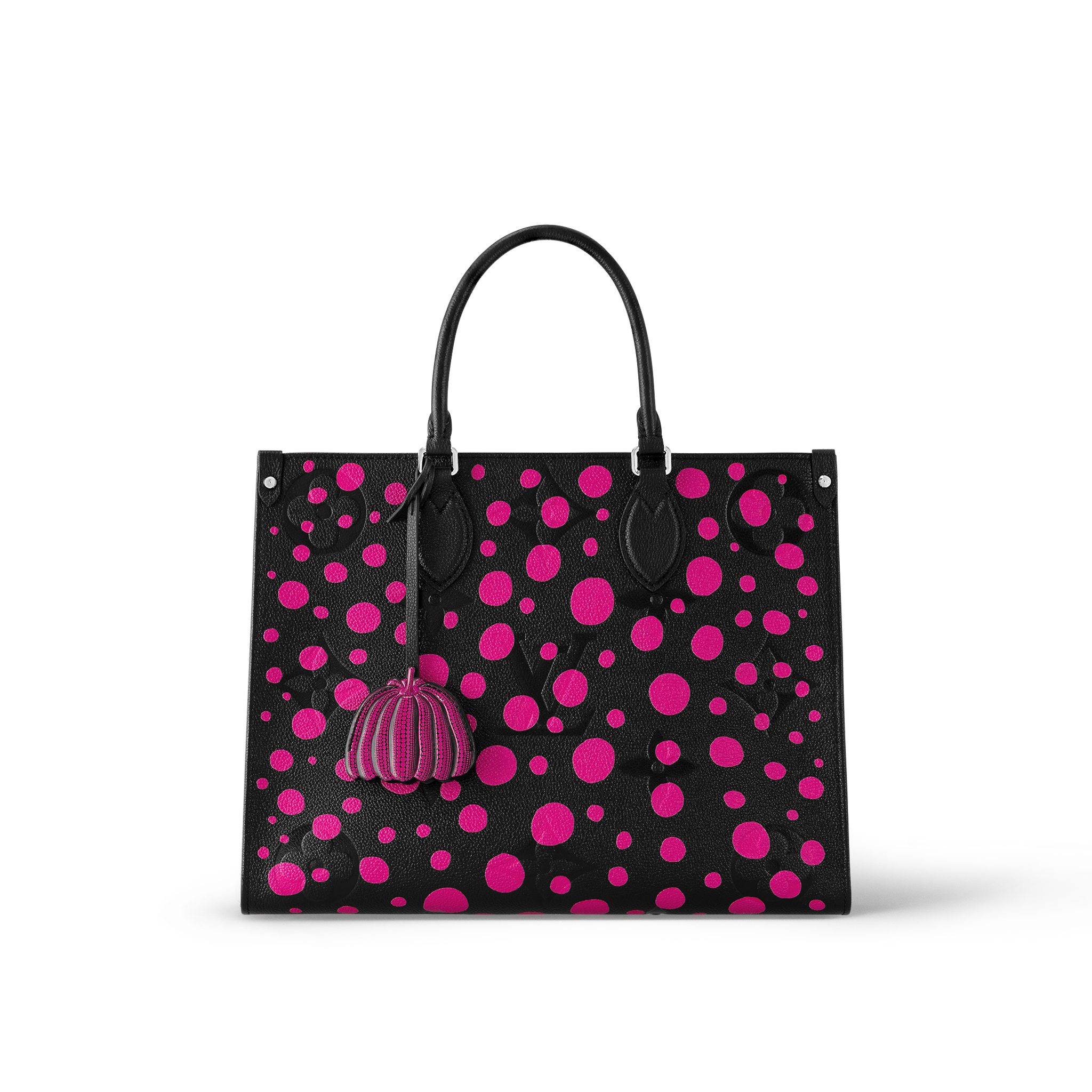 For the new Louis Vuitton x Yayoi Kusama collection, the LVxYK OnTheGo MM features the "Infinity Dots" theme. An influential figure of the avant-garde since the 1960s, the venerated Japanese artist is known for her use of dazzling dotted patterns. For this spacious, user-friendly bag, bright fuchsia dots adorn sumptuous black Monogram Empreinte cowhide. And it comes with a removable charm shaped like a pumpkin, another of Kusama's visual signatures.