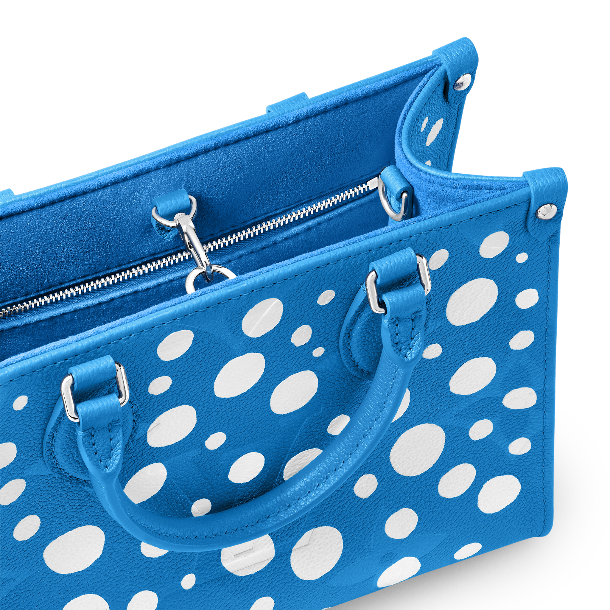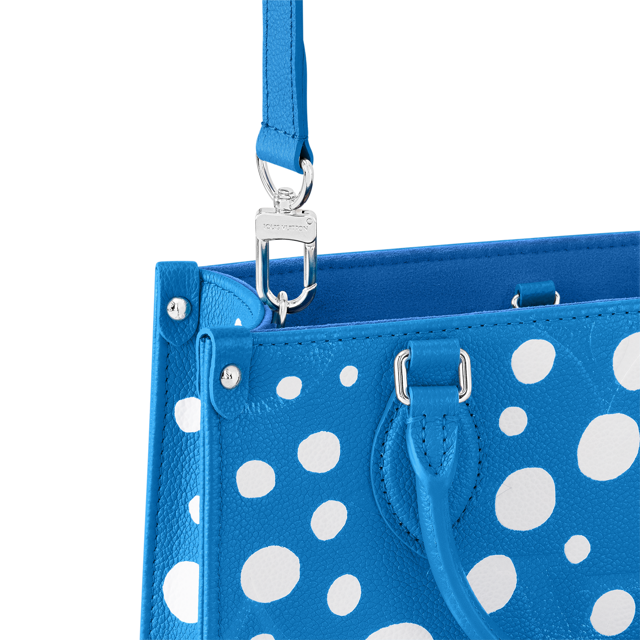 The "Infinity Dots" print gives the LVxYK OnTheGo PM a psychedelic look for the new Louis Vuitton x Yayoi Kusama collection. The acclaimed Japanese artist has been fascinated with dotted patterns since childhood, using them in her paintings and sculptures to convey a sense of infinity. For this compact, functional handbag, radiant white dots adorn bright blue Monogram Empreinte cowhide. And the pumpkin-shaped charm evokes another of Kusama's visual signatures.