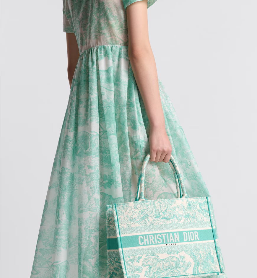 Introduced by Maria Grazia Chiuri, Creative Director of Christian Dior, the Dior Book Tote has become a staple of the Dior aesthetic and is part of the Dioriviera capsule. Designed to hold all the daily essentials, it is fully embroidered with the Toile de Jouy motif in aquamarina. Enhanced by a Christian Dior Paris signature on the front, the medium tote exemplifies the House's savoir-faire and may be carried by hand or worn over the shoulder.