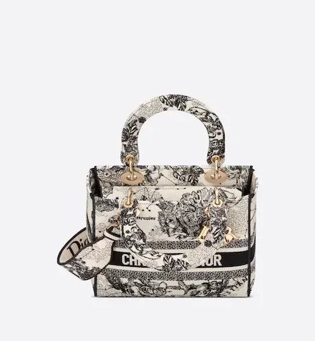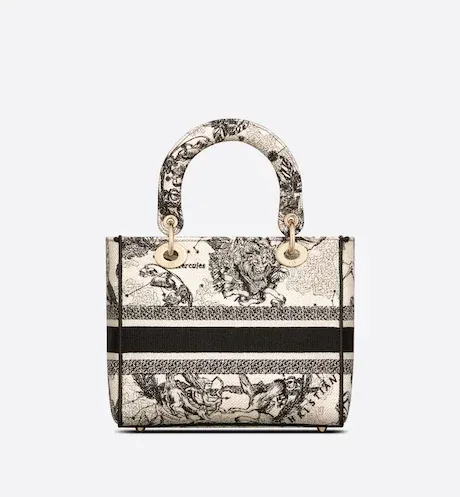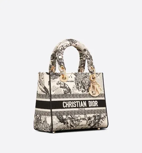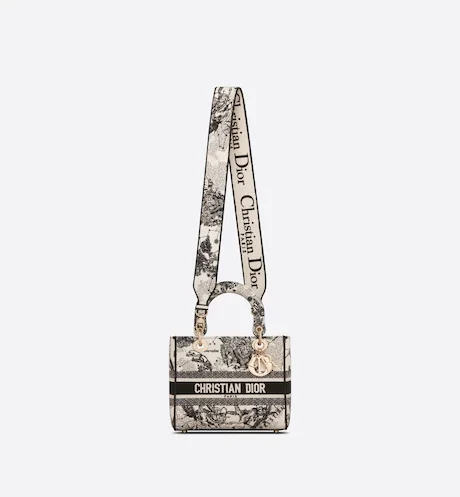 The Lady D-Lite bag combines classic elegance with House modernity. The style is fully embroidered with the latte multicolor Toile de Jouy Zodiac motif, a new take on the iconic pattern inspired by Mr. Dior's passion for astrology. A 'CHRISTIAN DIOR' signature adorns the front, while thick 'D.I.O.R.' charms in pale gold-finish metal further enhance and highlight the silhouette. Featuring a wide, reversible and removable embroidered shoulder strap, the medium Lady D-Lite bag can be carried by hand, worn over the shoulder or crossbody.