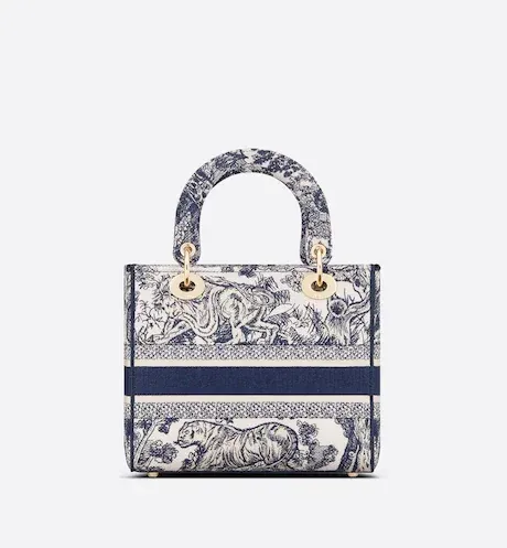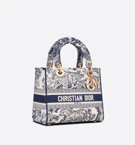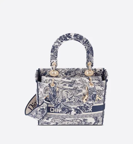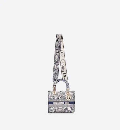 The Lady D-Lite bag combines classic elegance with House modernity. The style is fully embroidered with the latte multicolor Toile de Jouy Zodiac motif, a new take on the iconic pattern inspired by Mr. Dior's passion for astrology. A 'CHRISTIAN DIOR' signature adorns the front, while thick 'D.I.O.R.' charms in pale gold-finish metal further enhance and highlight the silhouette. Featuring a wide, reversible and removable embroidered shoulder strap, the medium Lady D-Lite bag can be carried by hand, worn over the shoulder or crossbody.