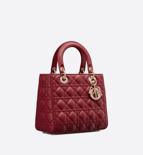The Lady Dior handbag epitomizes the House's vision of elegance and beauty. Sleek and refined, the timeless yet relevant style is crafted in cherry red lambskin with Cannage stitching, creating the instantly recognizable quilted texture. The pale gold-finish metal signature 'D.I.O.R.' charms offer an elegant allure. Featuring a thin, removable leather shoulder strap, the medium Lady Dior bag can be carried by hand, worn over the shoulder or crossbody.