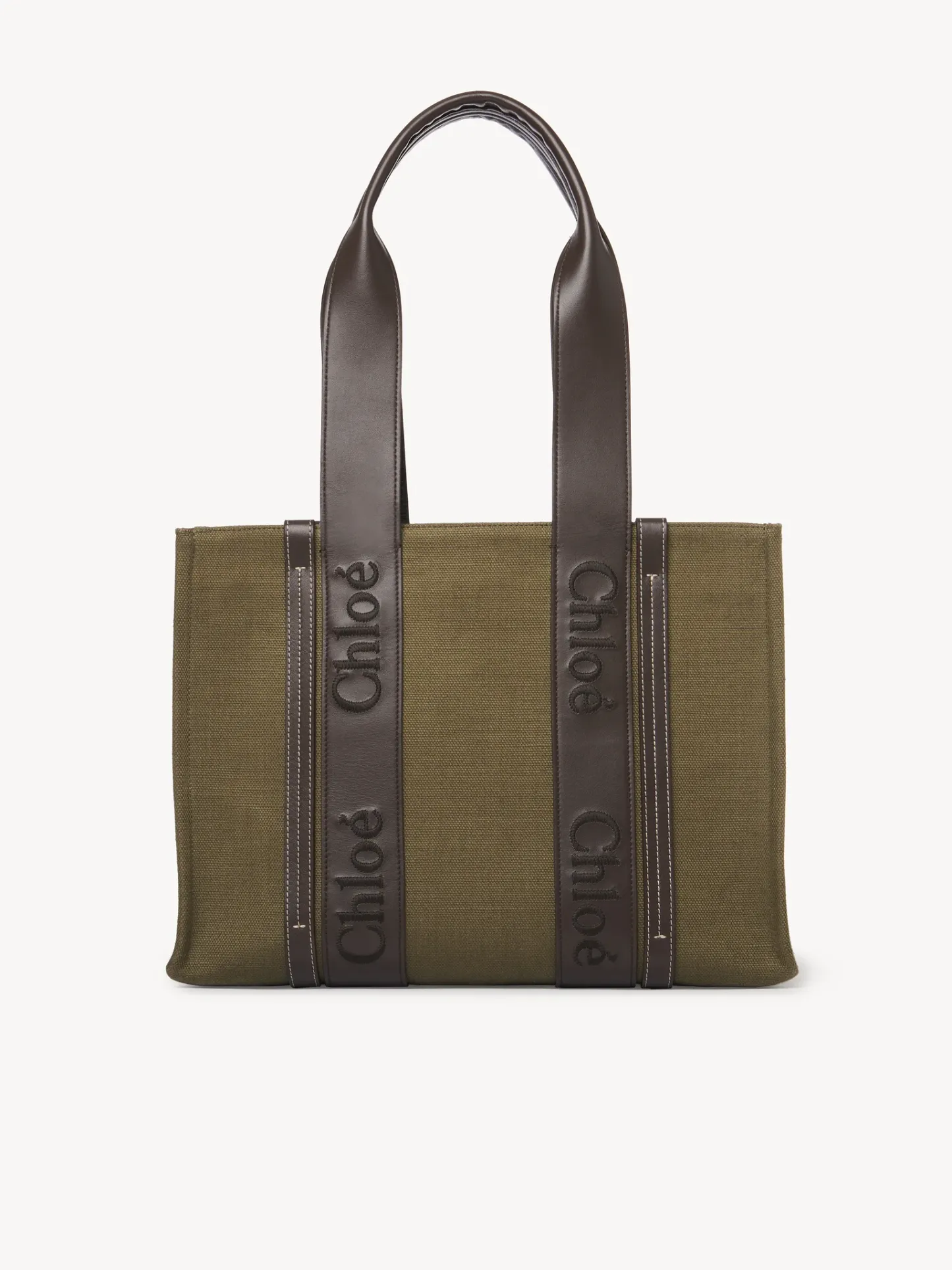 The bag's sharp, modern lines are emphasized by the vertical leather strips and the signature Chloé logo carried over from the Woody mule and revisited in tonal embroidery on calfskin. Carry this tote bag comfortably on the shoulder.