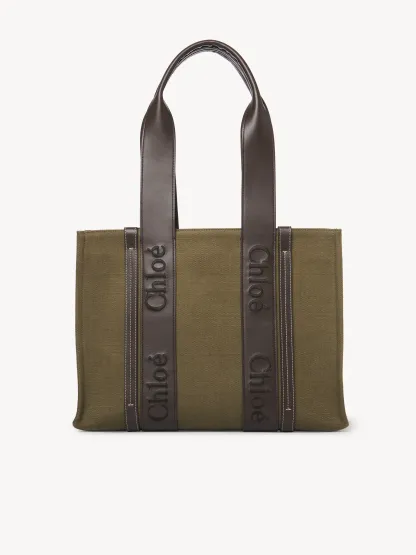 Crafted from an authentic combination of linen canvas and shiny calfskin, this medium Woody tote bag is a spacious bag with a natural yet elevated aesthetic. The roomy inside compartment includes a practical flat pocket.