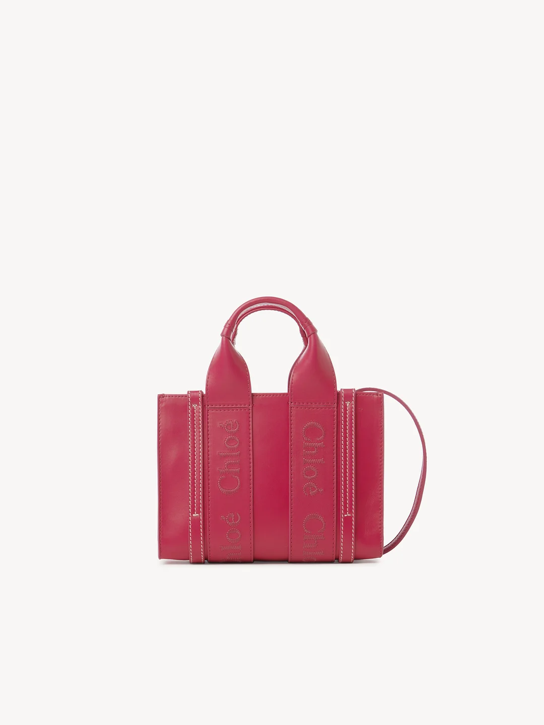 The Woody line is characterized by the signature Chloé logo carried over from the Maison's iconic mules. It showcases a modern, minimalist silhouette ranging from nano to large sizes.