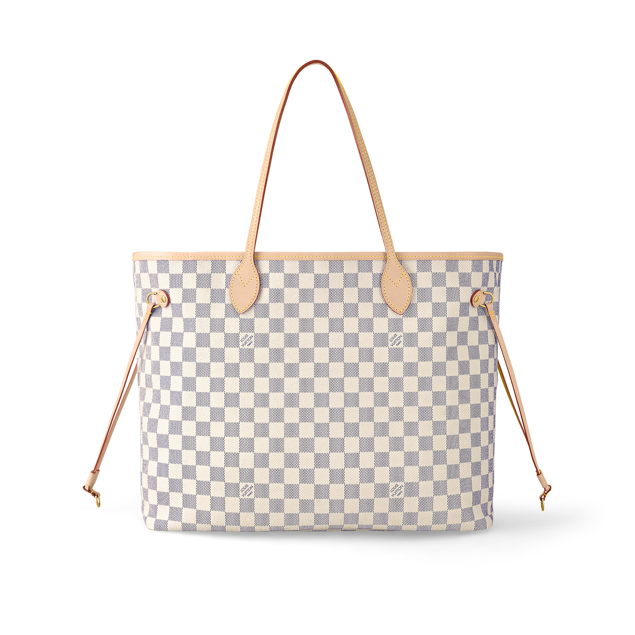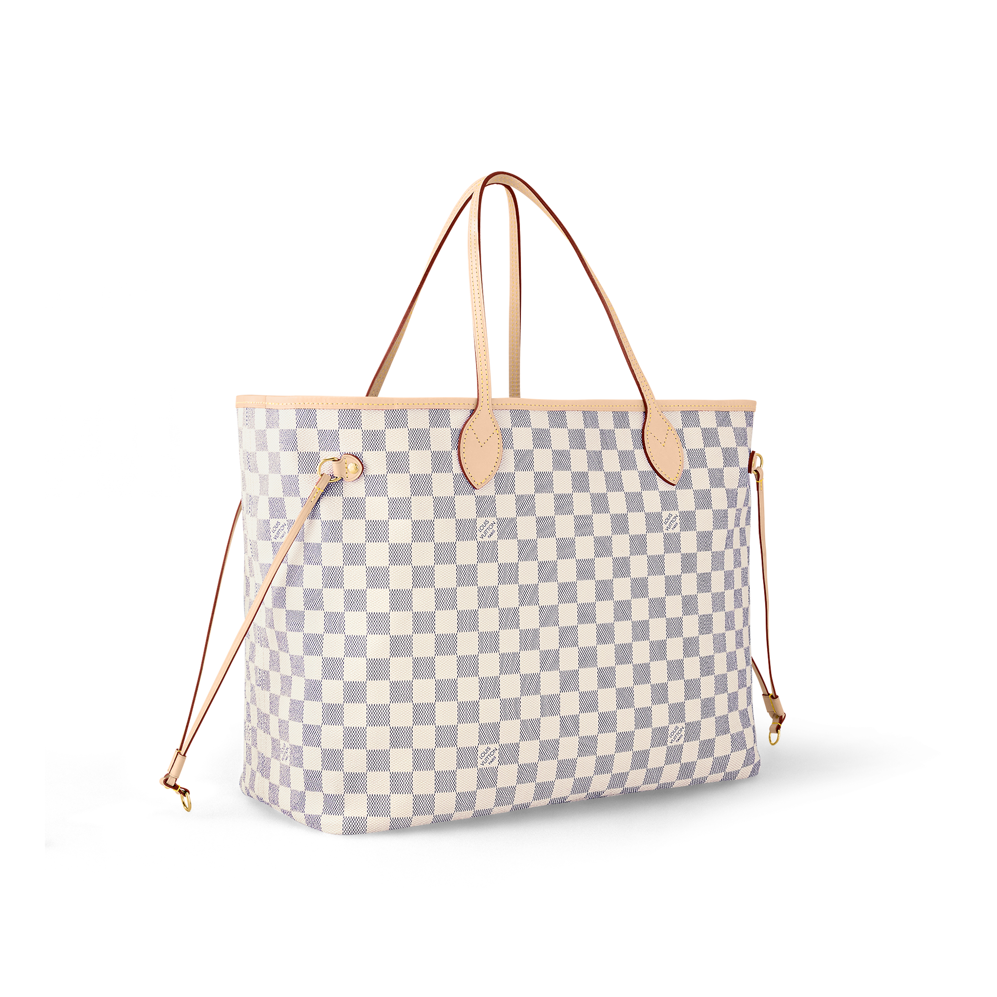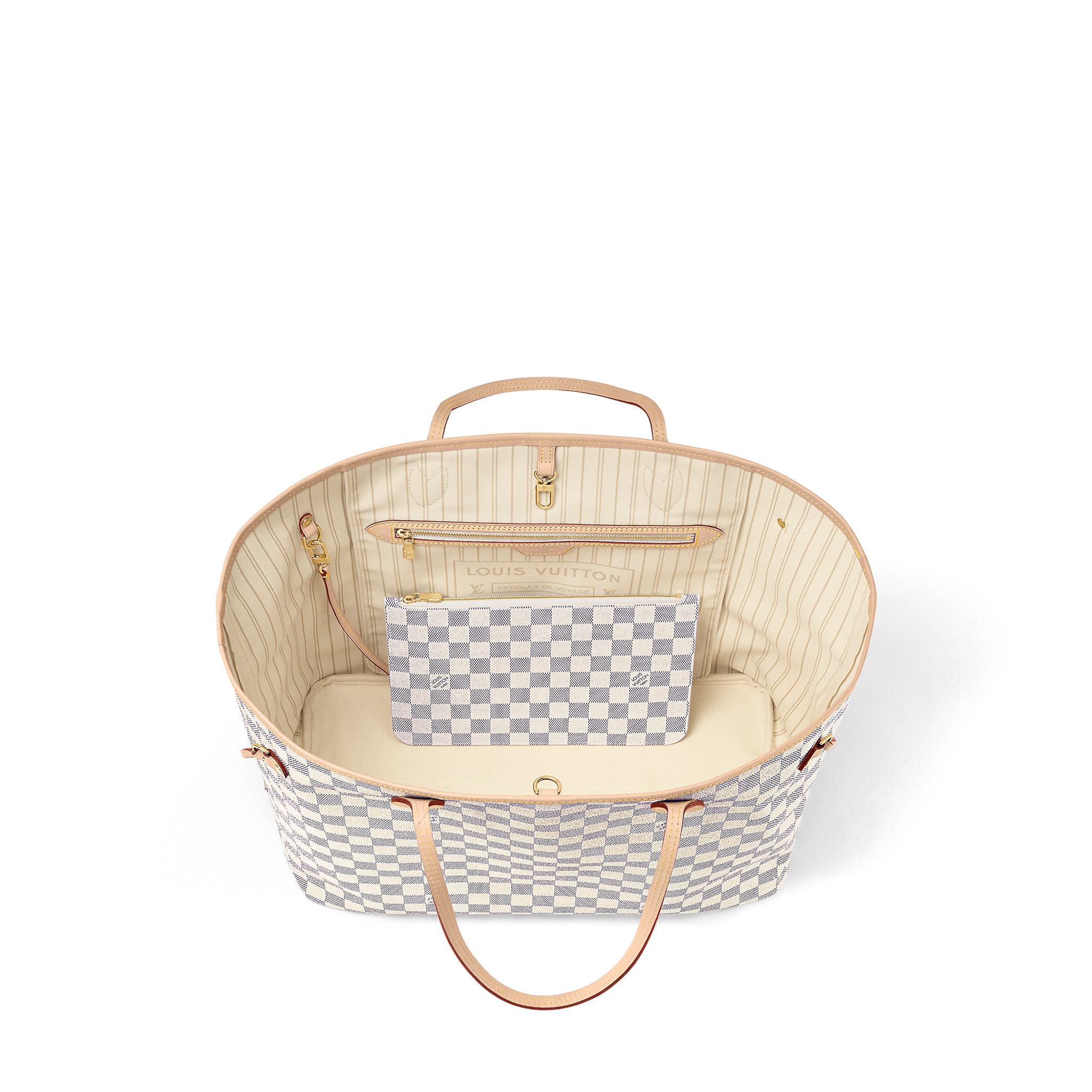 The Neverfull GM tote unites timeless design with heritage details. Crafted from fresh Damier Azur canvas with natural cowhide trim, it is ultra-roomy yet never bulky, with side laces that cinch for a sleek allure or loosen for a more casual look. Slim, comfortable handles slip easily over the shoulder or arm. Lined in colorful textile, it features a removable pouch which can serve as a clutch or an extra pocket.