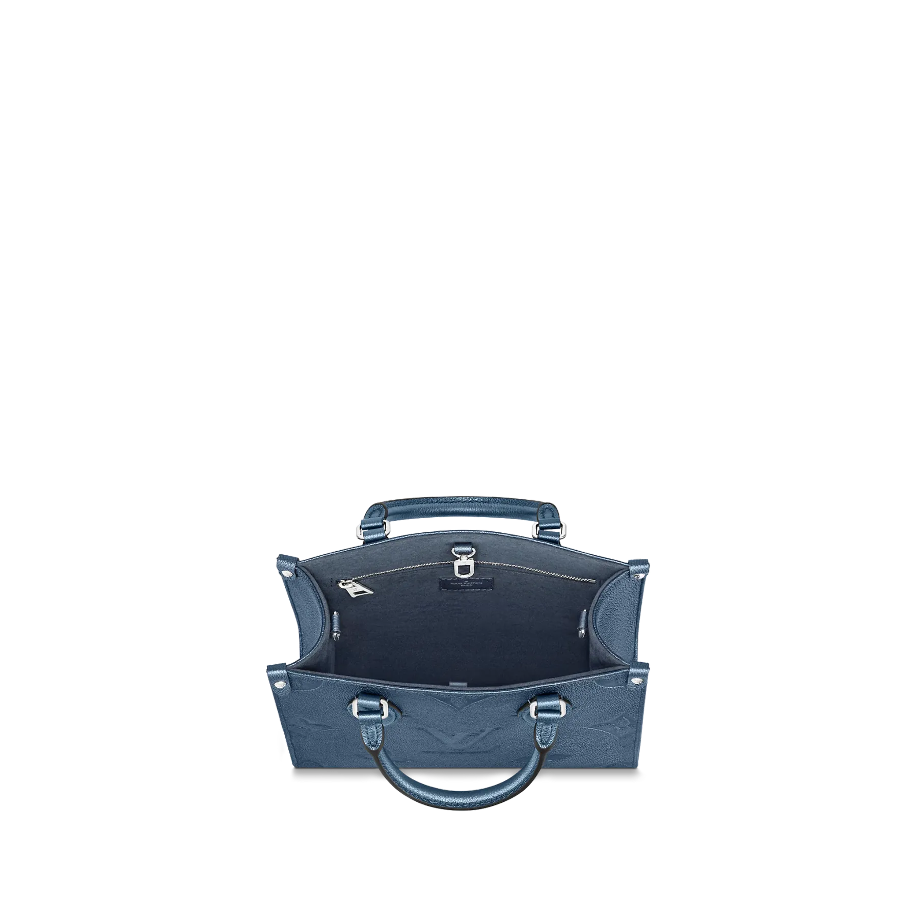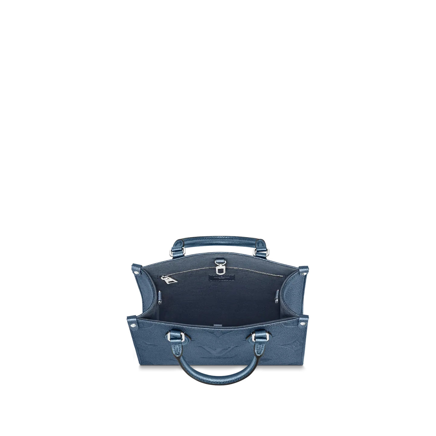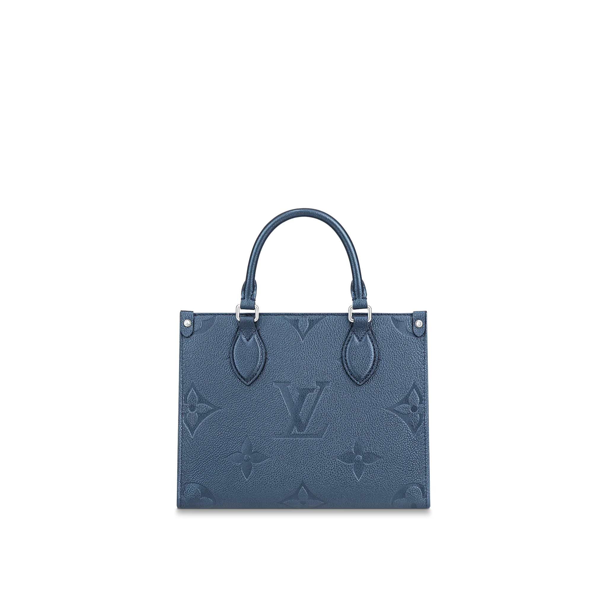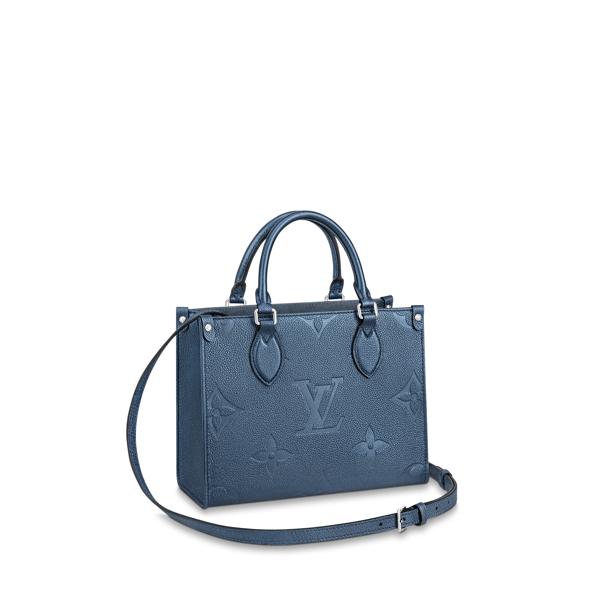 The compact OnTheGo PM tote is made from shimmering and festive navy-blue Monogram Empreinte leather, embossed with an oversized Monogram pattern. This smaller version of the original OnTheGo holds essential items such as an iPad Mini, phones and wallet. It can be hard-carried with its Toron handles or worn on the shoulder or as a crossbody thanks its adjustable, removable strap.