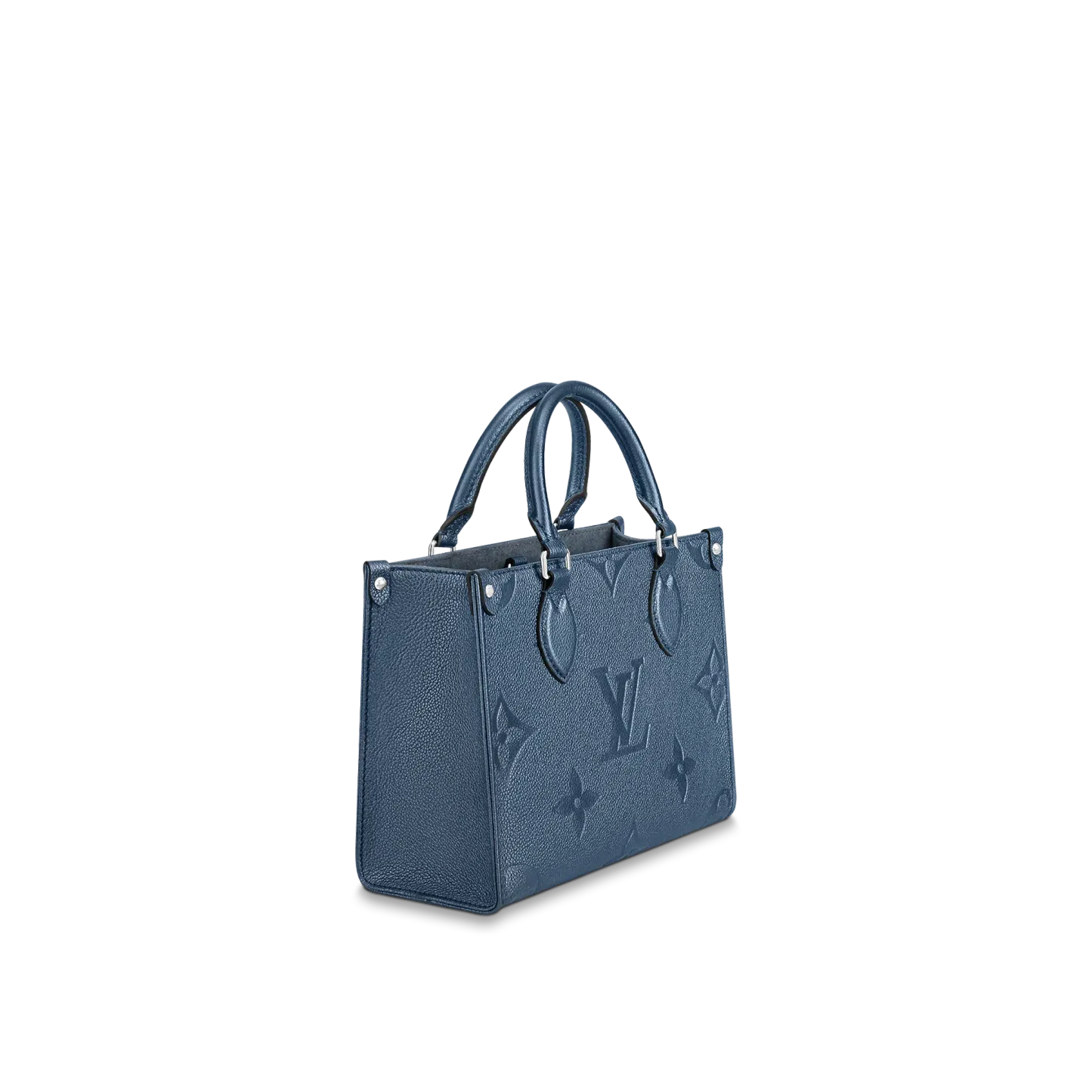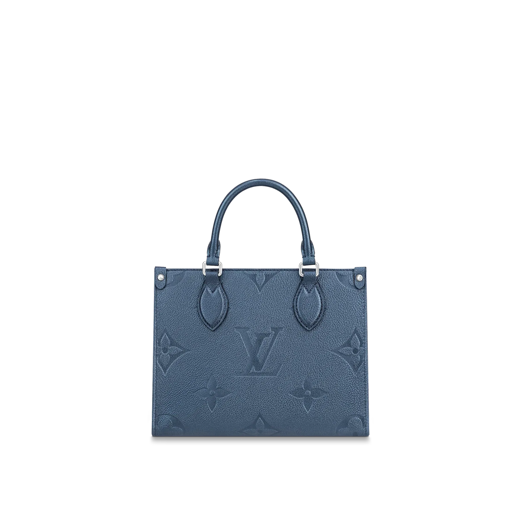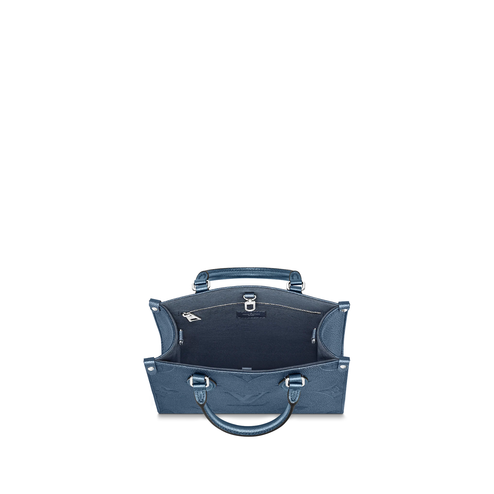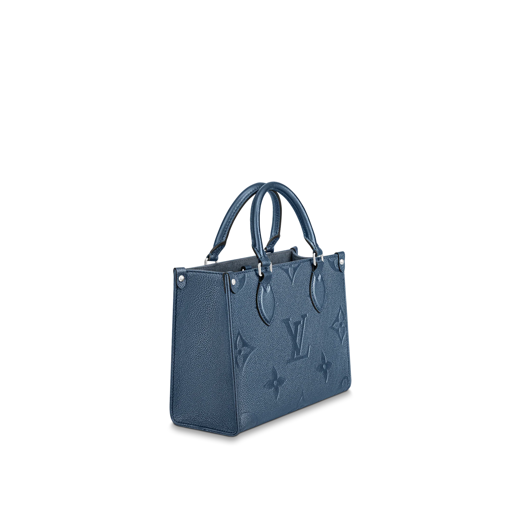 The compact OnTheGo PM tote is made from shimmering and festive navy-blue Monogram Empreinte leather, embossed with an oversized Monogram pattern. This smaller version of the original OnTheGo holds essential items such as an iPad Mini, phones and wallet. It can be hard-carried with its Toron handles or worn on the shoulder or as a crossbody thanks its adjustable, removable strap.