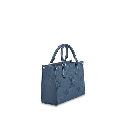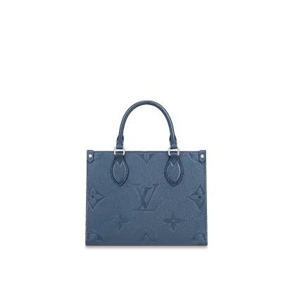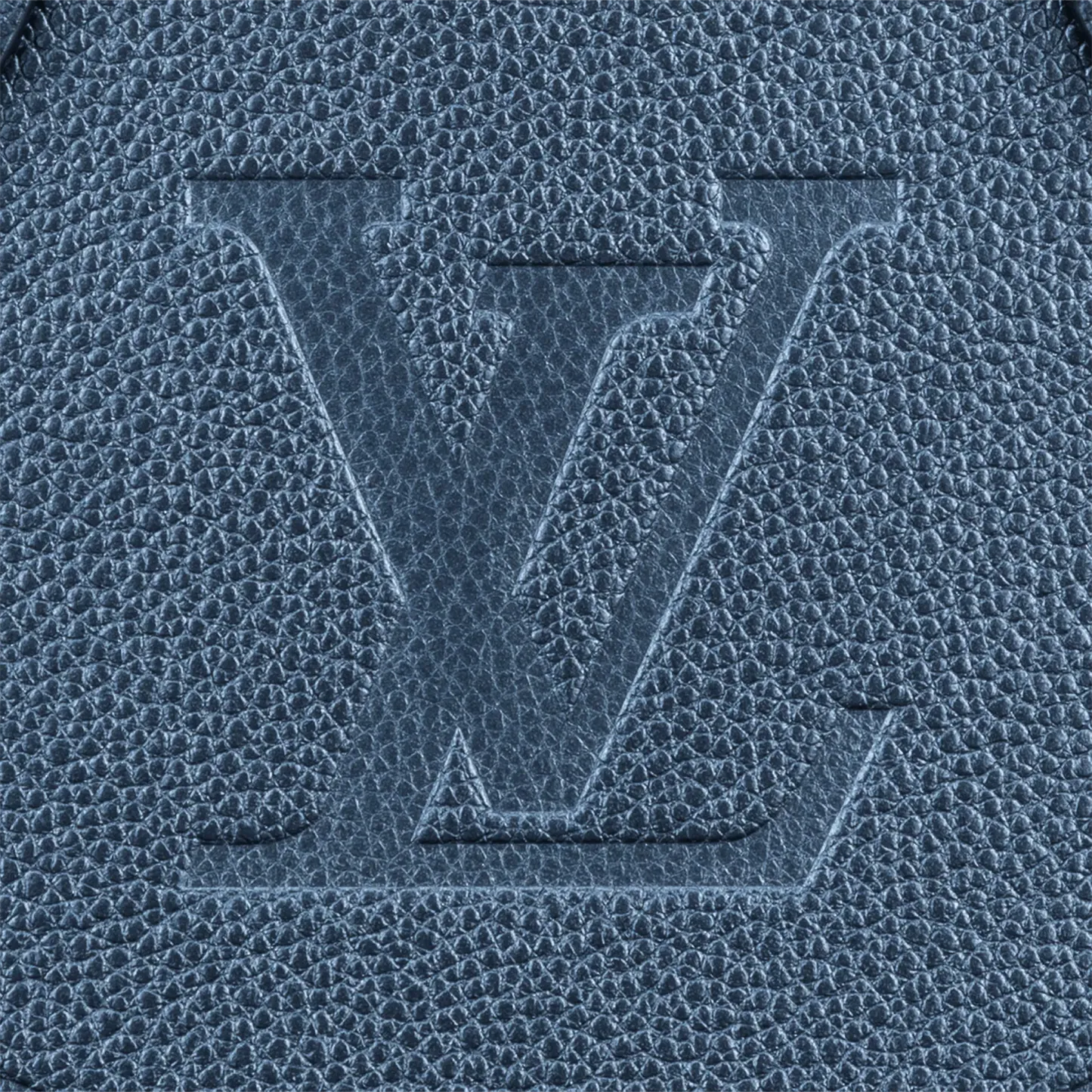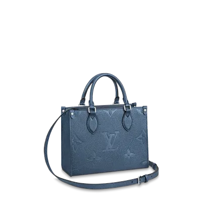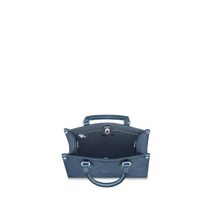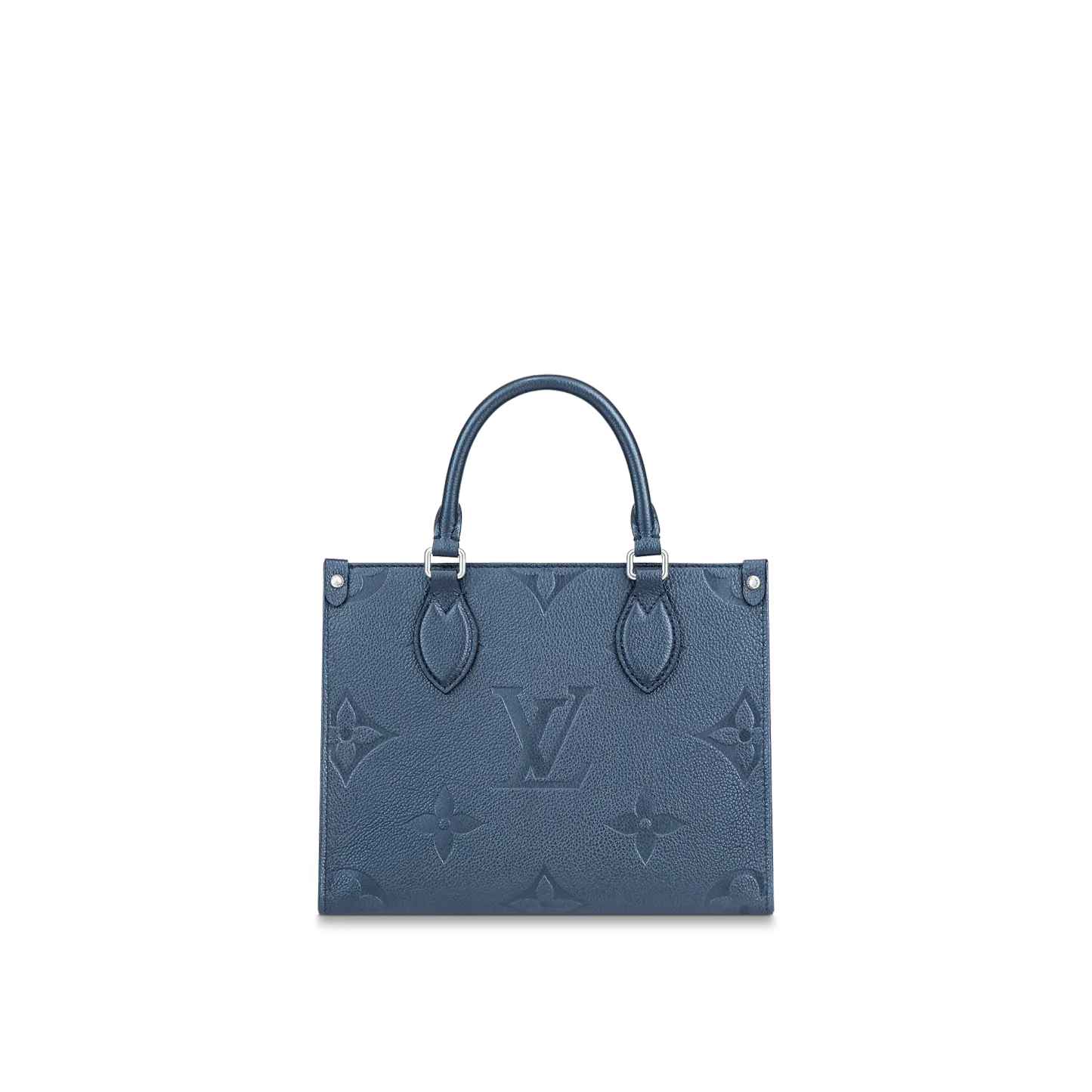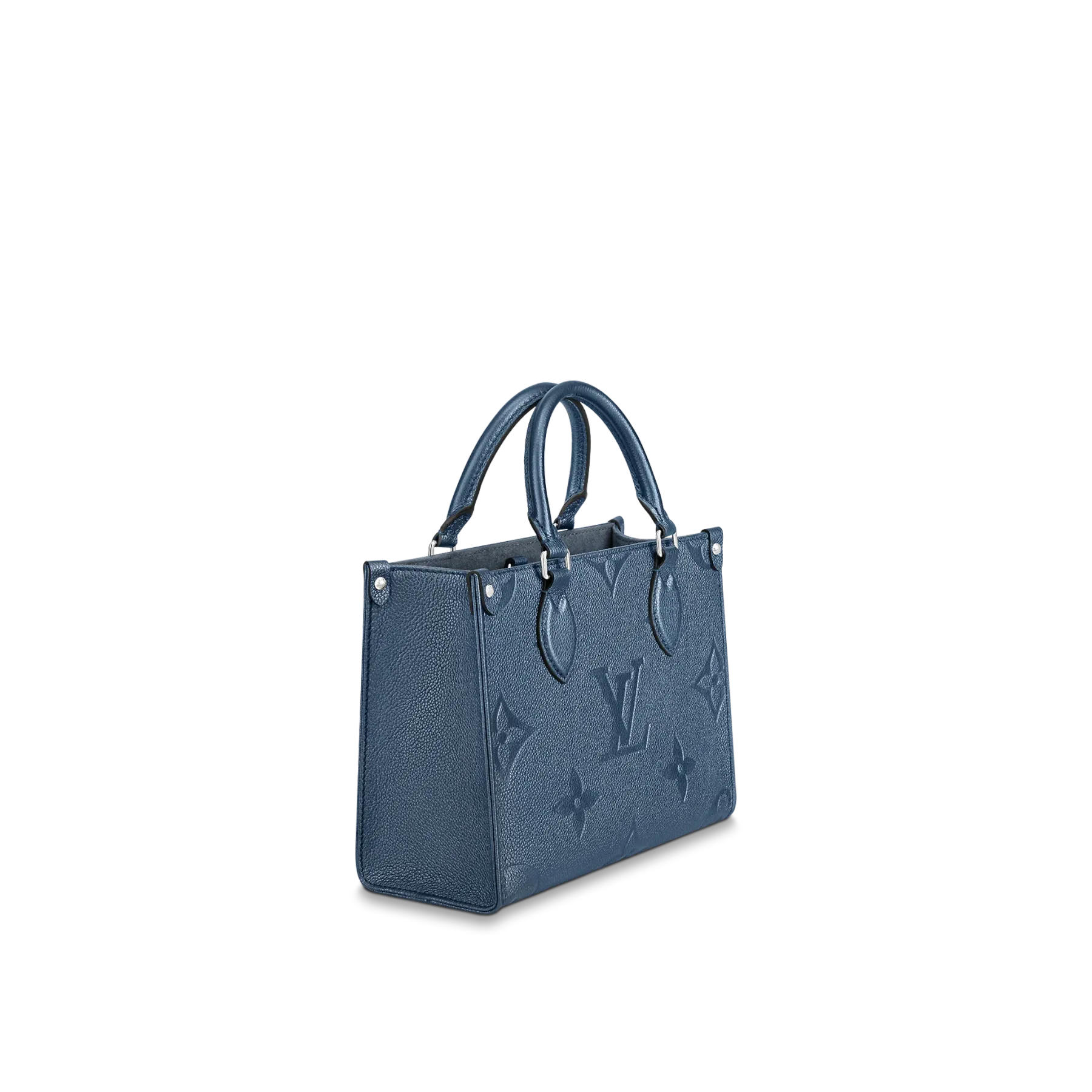 The compact OnTheGo PM tote is made from shimmering and festive navy-blue Monogram Empreinte leather, embossed with an oversized Monogram pattern. This smaller version of the original OnTheGo holds essential items such as an iPad Mini, phones and wallet. It can be hard-carried with its Toron handles or worn on the shoulder or as a crossbody thanks its adjustable, removable strap.