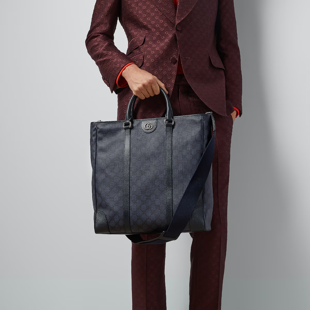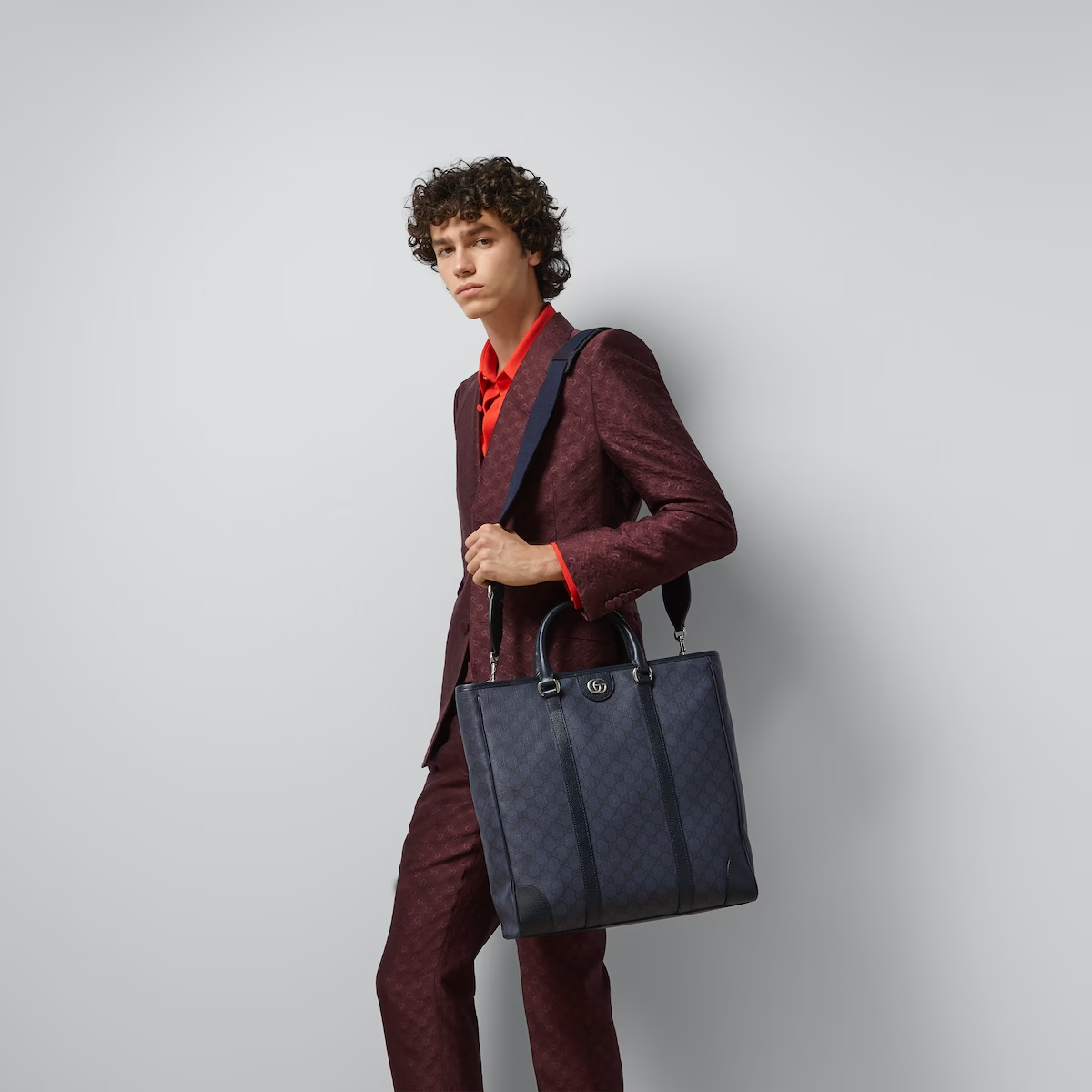 The GG Supreme Tender canvas, with its soft material and durable characteristics, lends itself well to the men's accessories line, adding a modern feel to established House designs. This Ophidia tote bag is presented in a blue and black variation of the GG Supreme Tender canvas, complete with the Double G hardware.